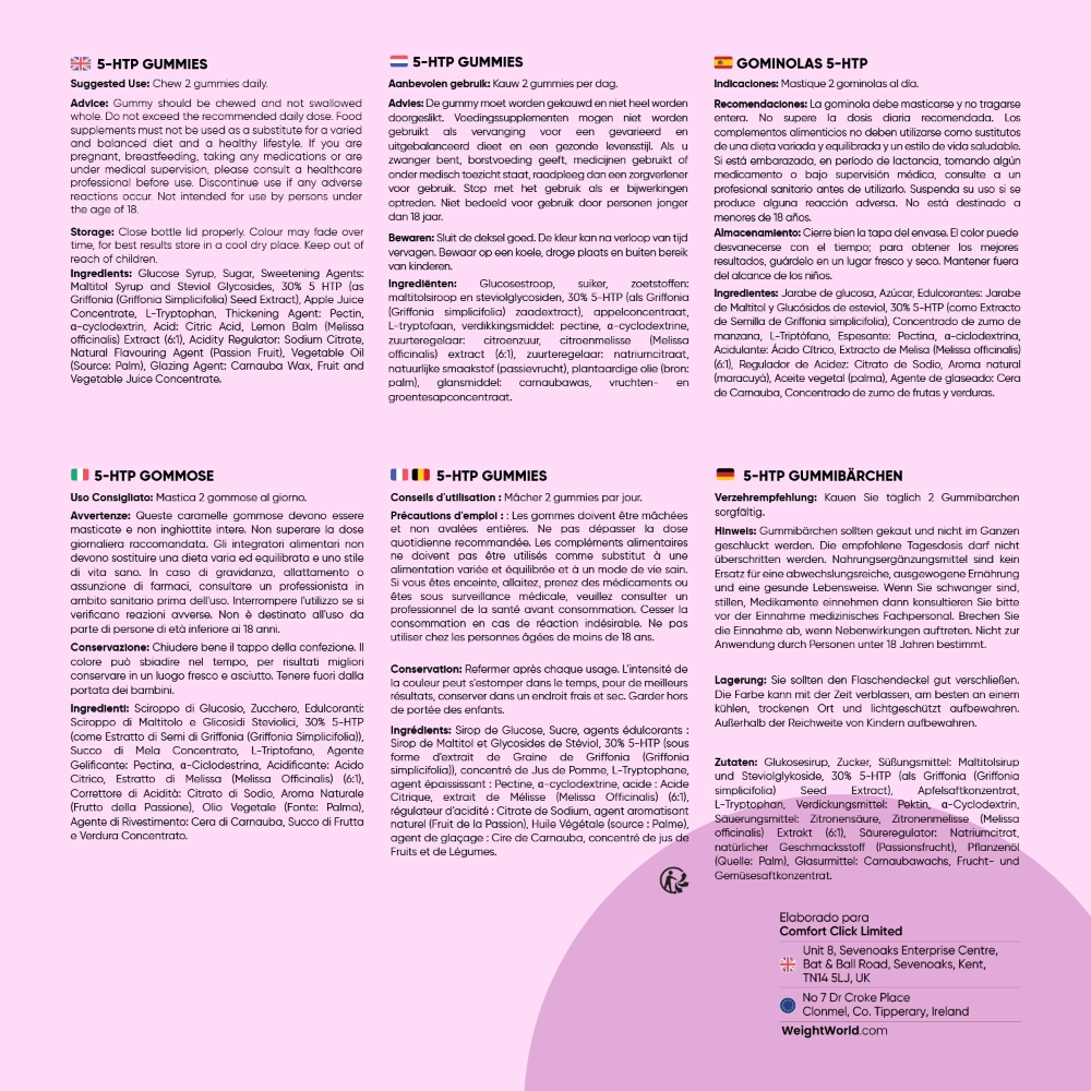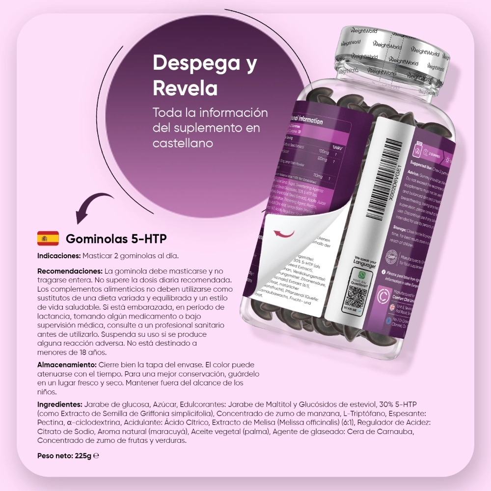Jarabe de glucosa, Azúcar, Edulcorantes: Jarabe de Maltitol y Glucósidos de esteviol, 30 % 5-HTP (como Extracto de Semilla de Griffonia simplicifolia), Concentrado de zumo de manzana, L-Triptófano, Espesante: Pectina, α-ciclodextrina, Acidulante: Ácido Cítrico, Extracto de Melisa (Melissa officinalis) (6:1), Regulador de Acidez: Citrato de Sodio, Aroma natural (maracuyá), Aceite vegetal (palma), Agente de glaseado: Cera de Carnauba, Concentrado de zumo de frutas y verduras.