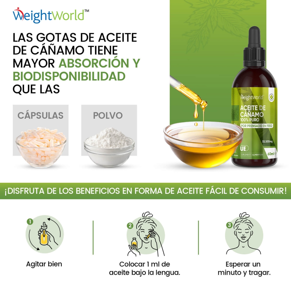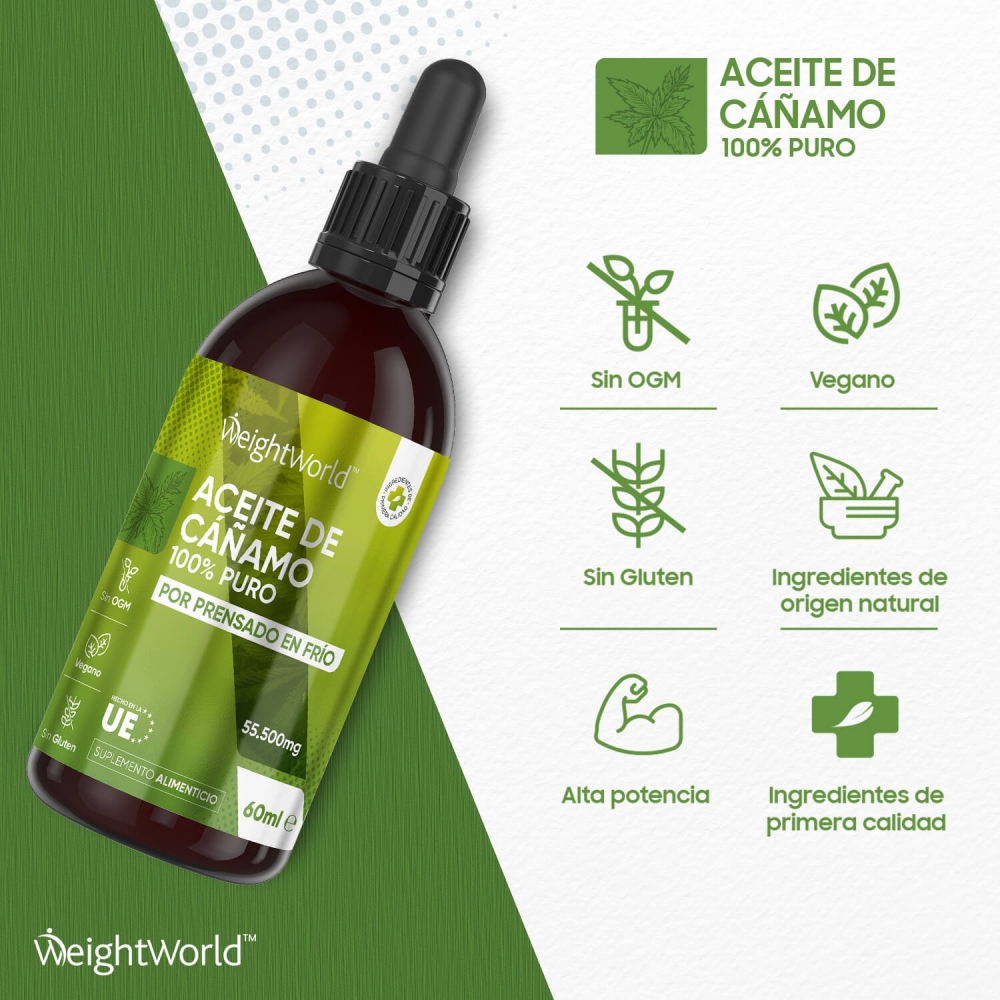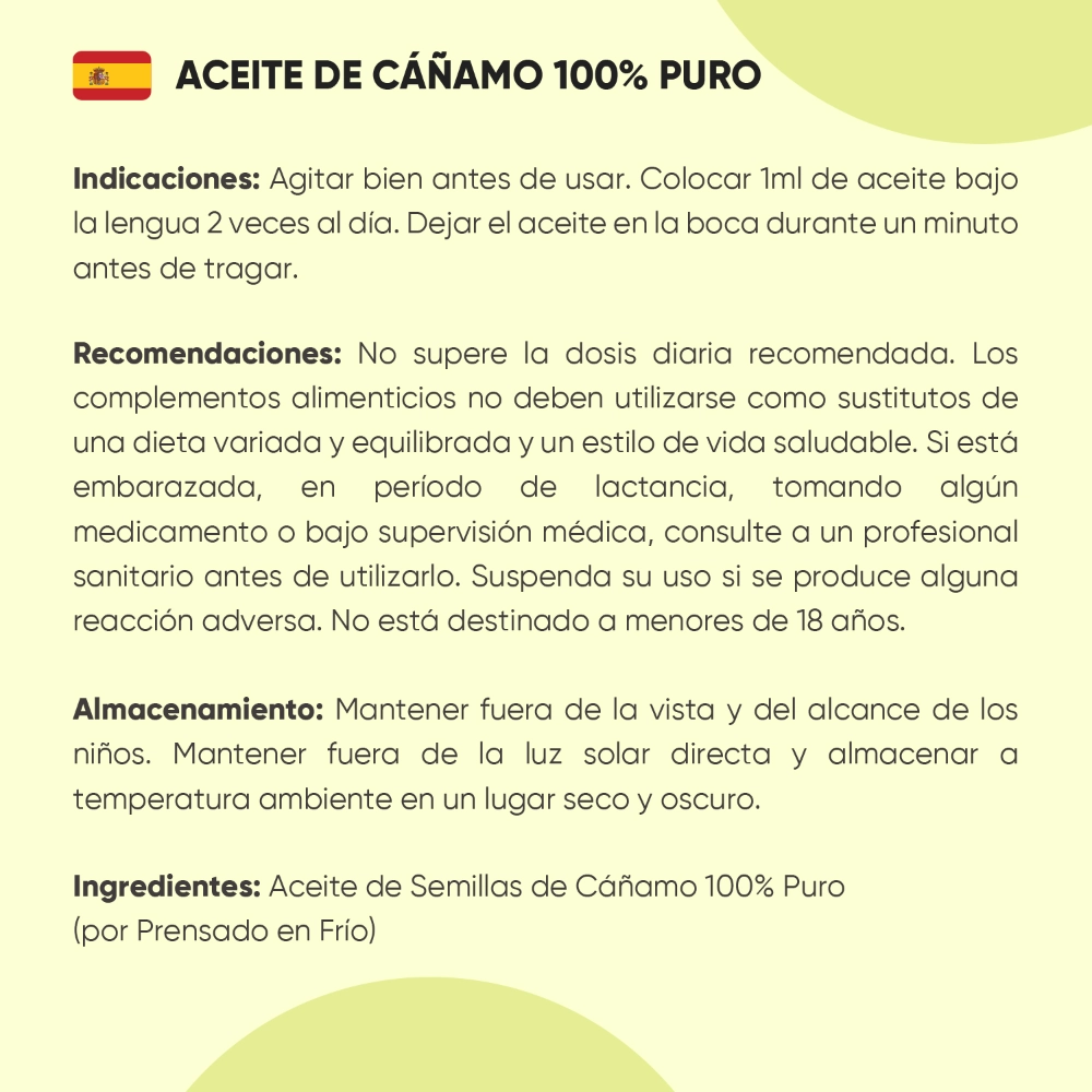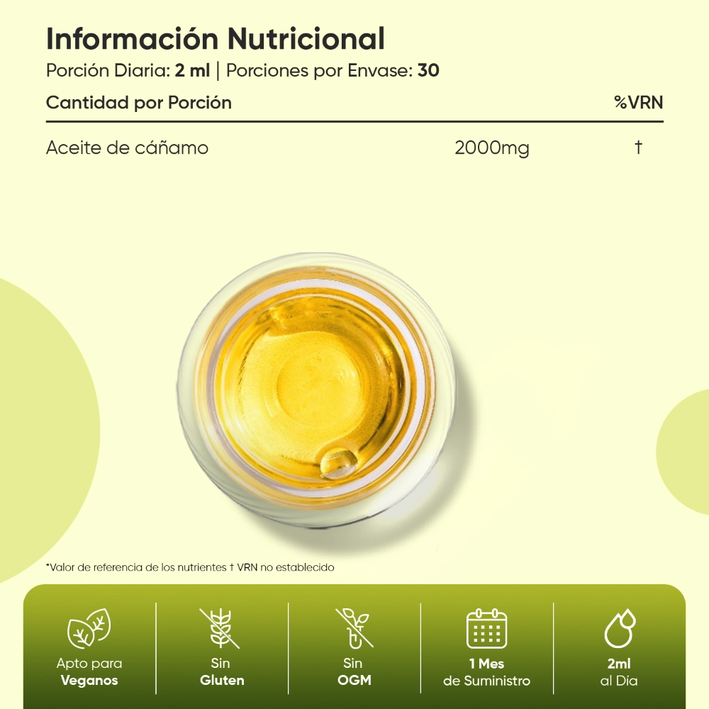 - Envase de 60 ml de aceite de semilla de cáñamo para 1 mes