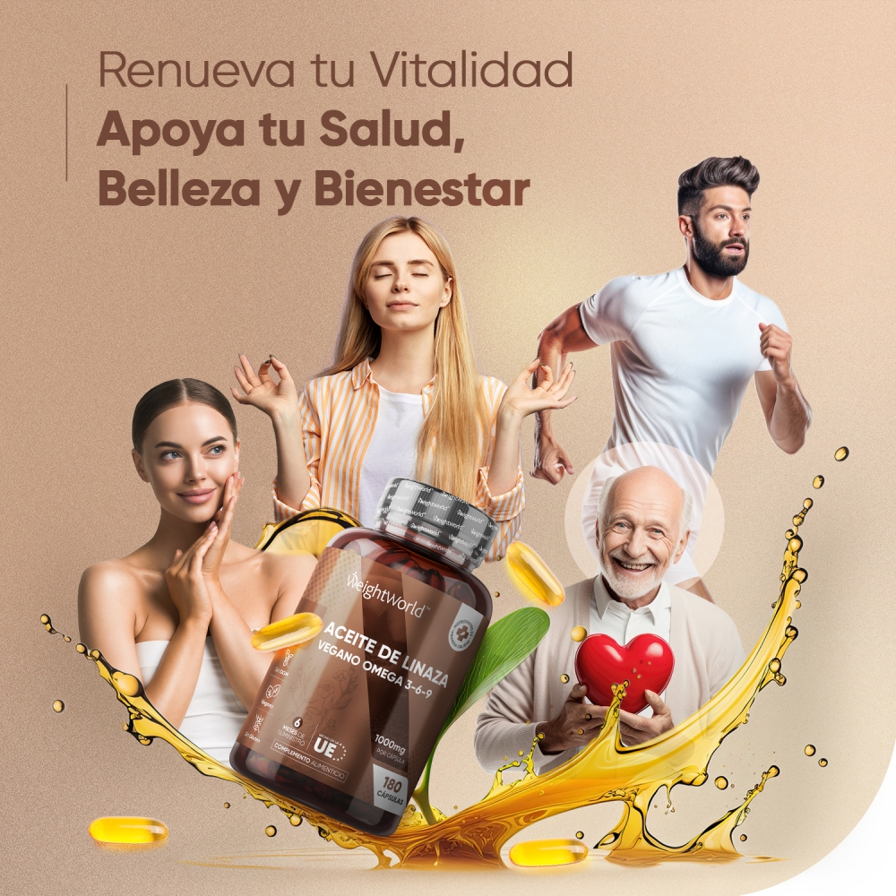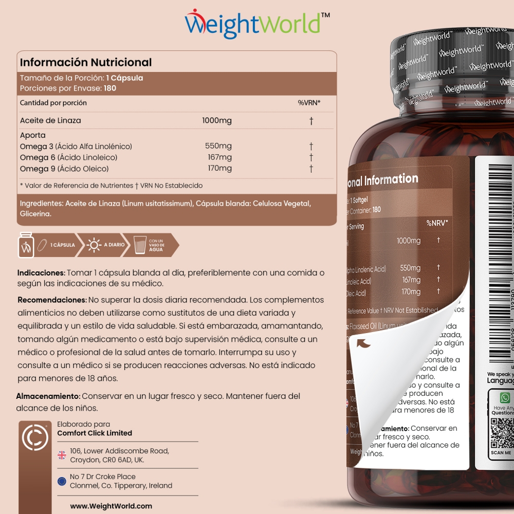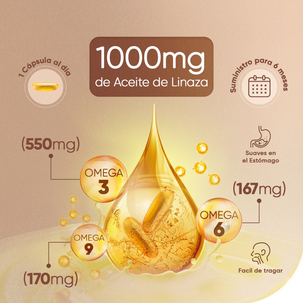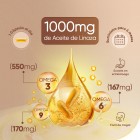 - Potente dosis de 1000 mg de aceite de lino rico en ácidos grasos Omega 3, 6 y 9.