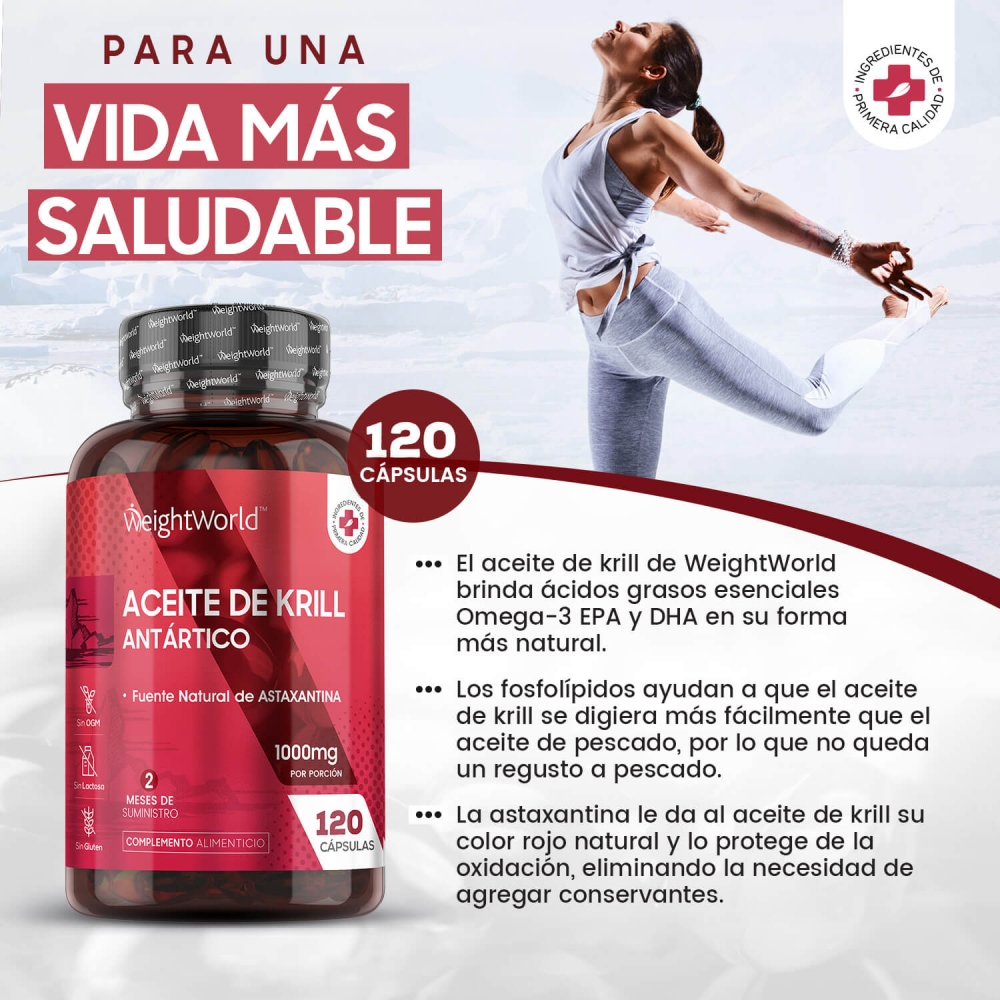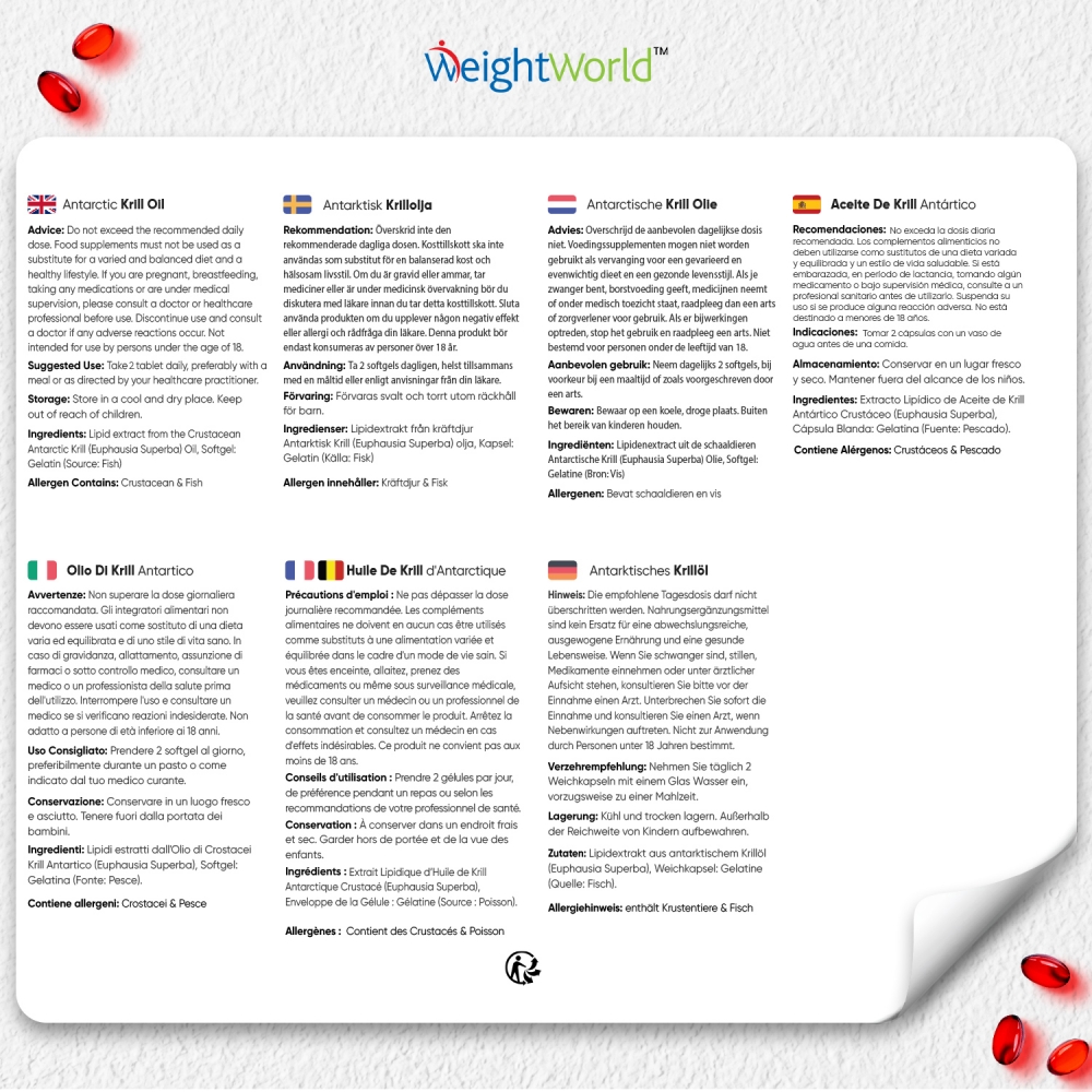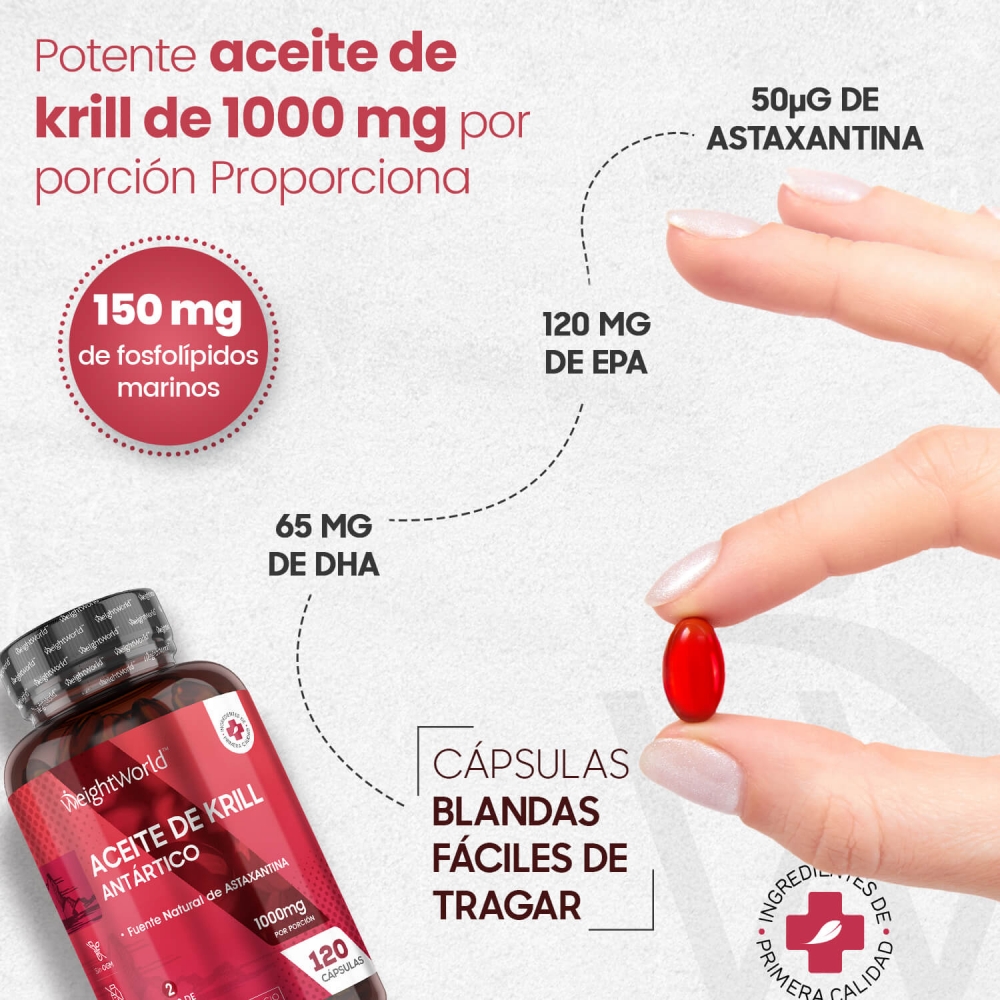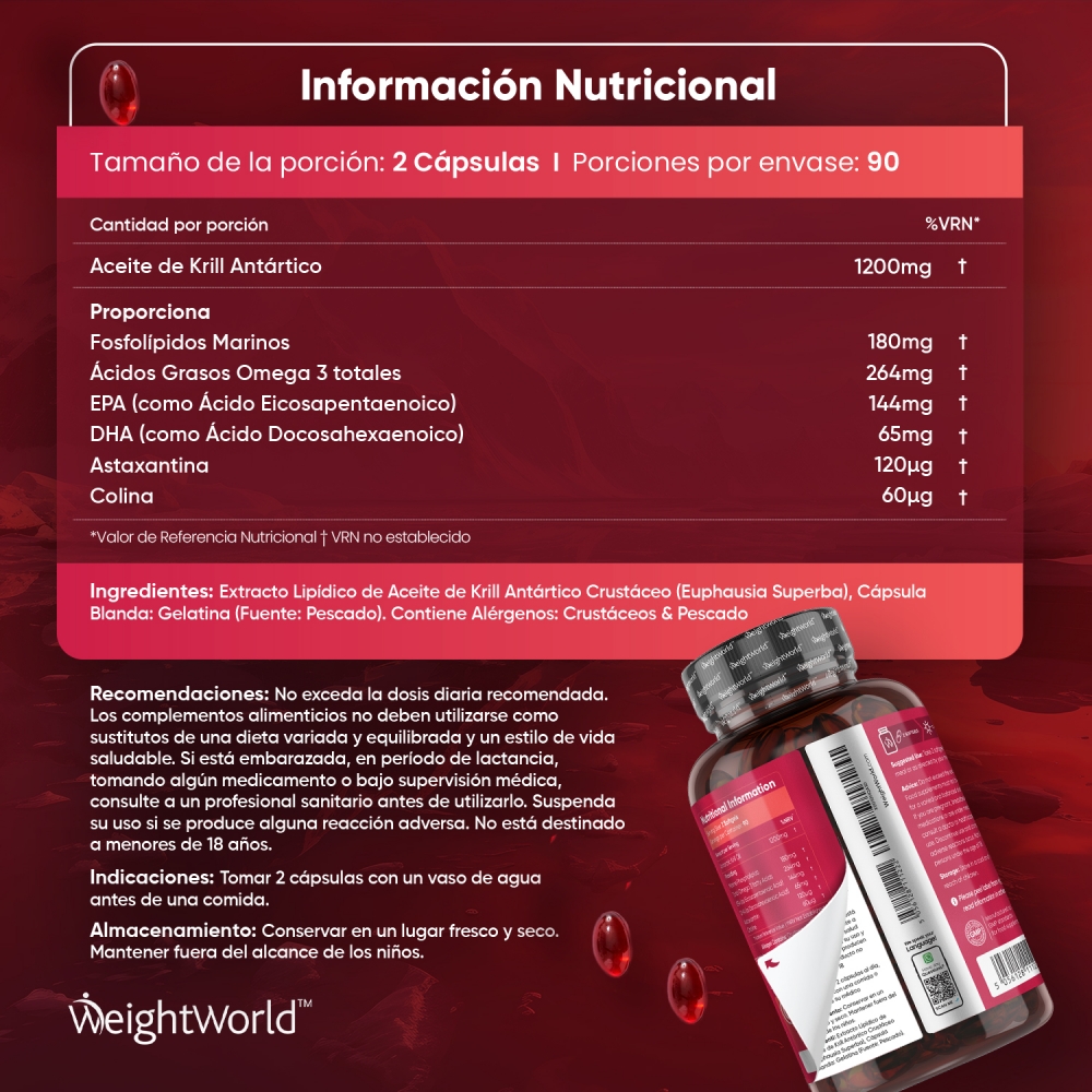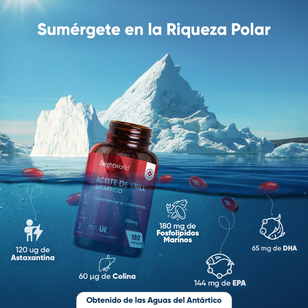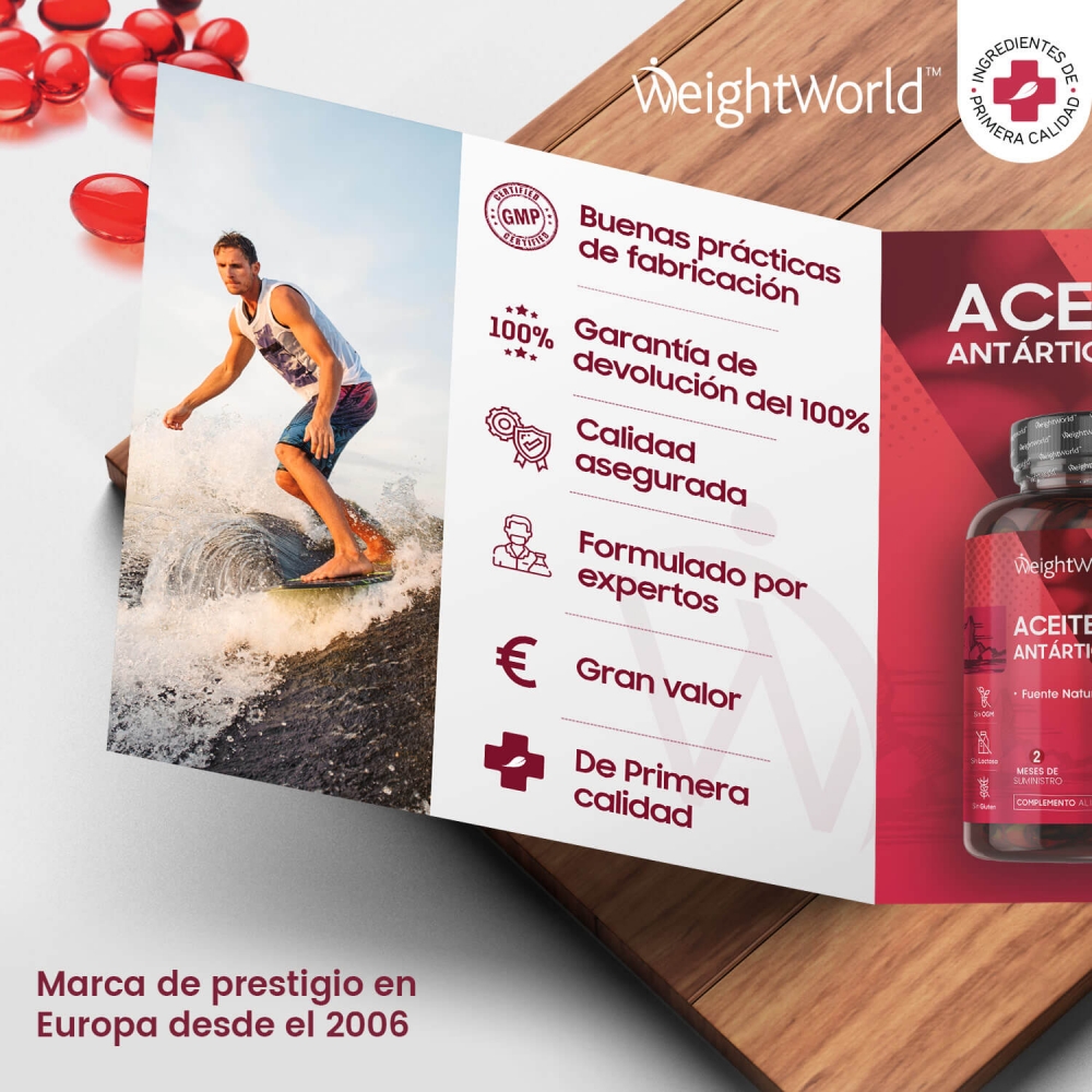 Las cápsulas de Aceite de Krill Antártico vienen avaladas por WeightWorld, tu marca de confianza presente en el mercado desde el año 2006. Más de 15 años de historia garantizan la máxima calidad de todos nuestros suplementos y productos, formulados con ingredientes de origen natural y sin OGM. Miles de clientes en más de una decena de países han depositado ya su confianza y bienestar en nosotros.
