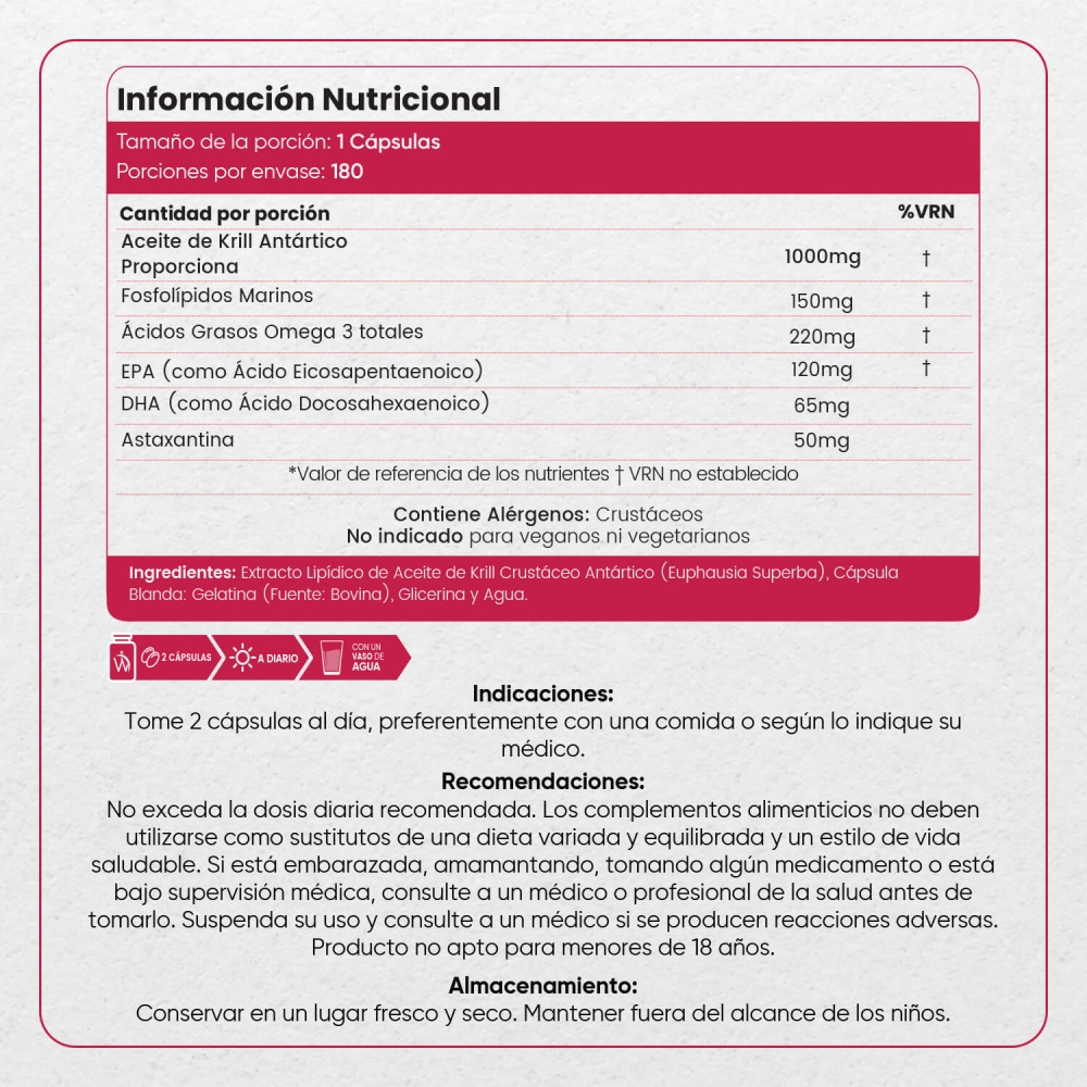 Cada envase contiene 180 cápsulas blandas suficientes para 3 meses de suministro. Por cada cápsula, obtendrás una dosis de 1200 mg de este beneficioso aceite para la salud y bienestar. Nuestro Aceite de Krill Antártico no contiene gluten, lactosa ni OGM.