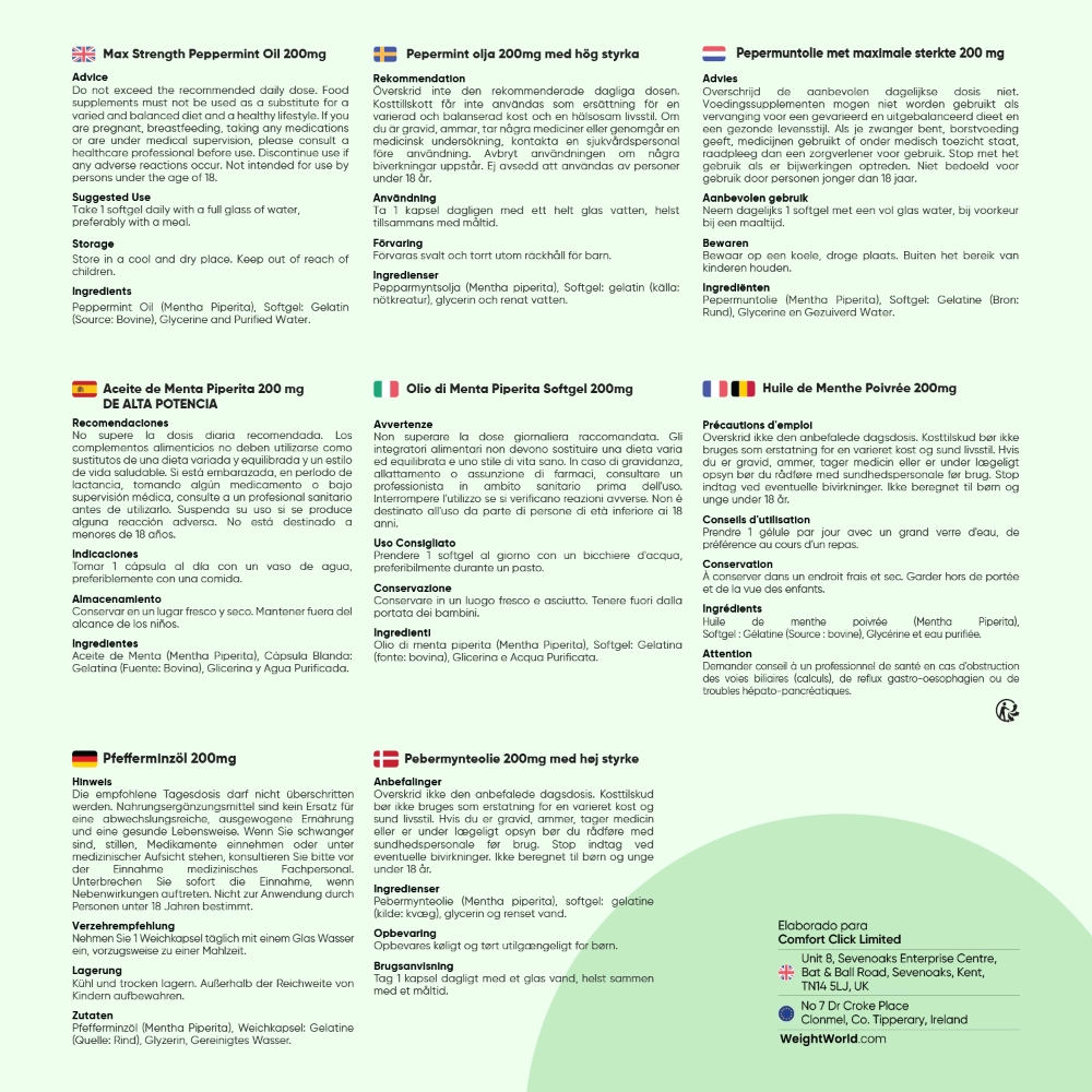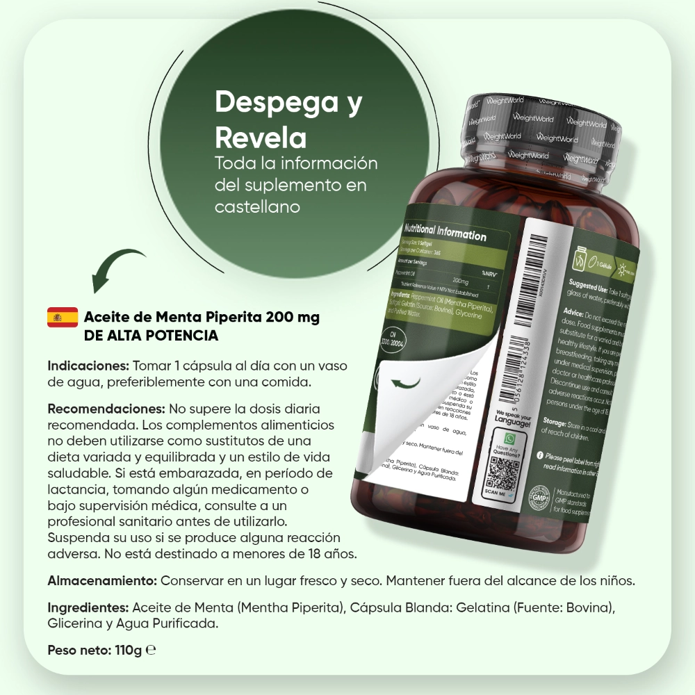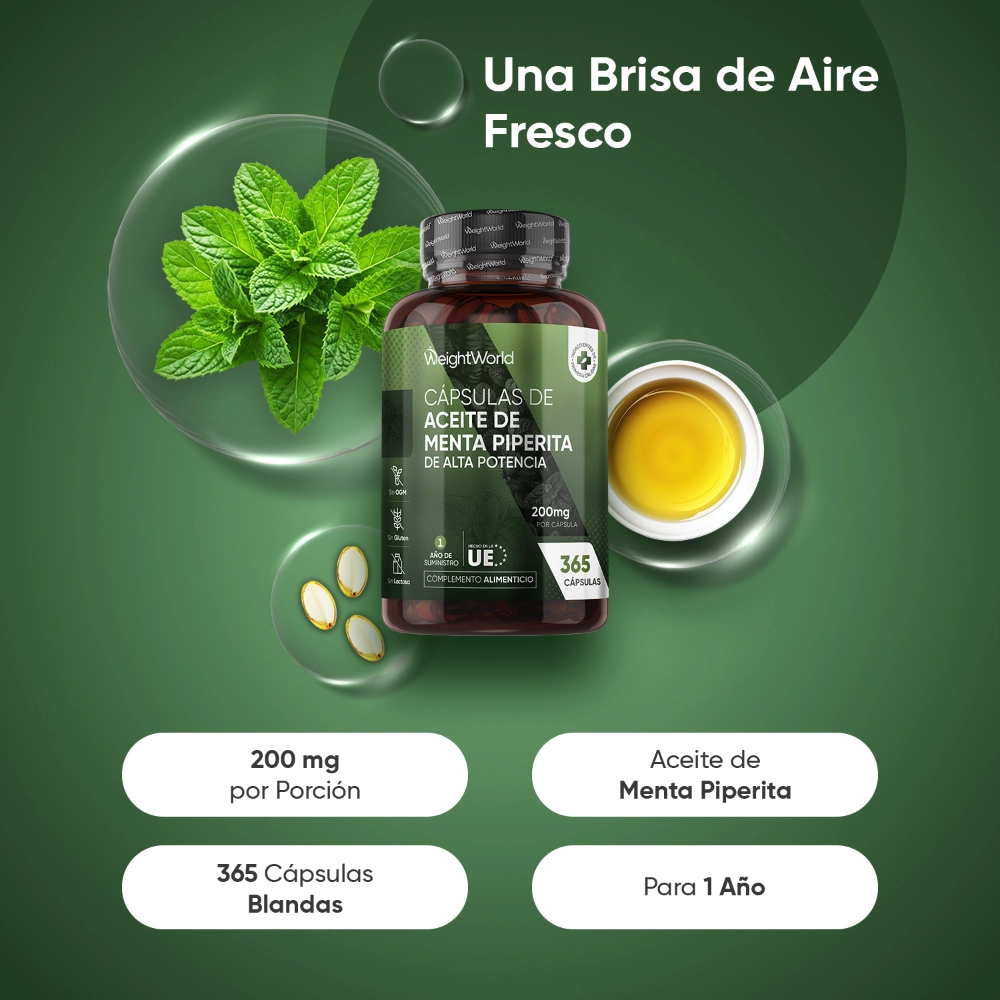 - Potente dosis de 200 mg de aceite de menta piperita por cápsula