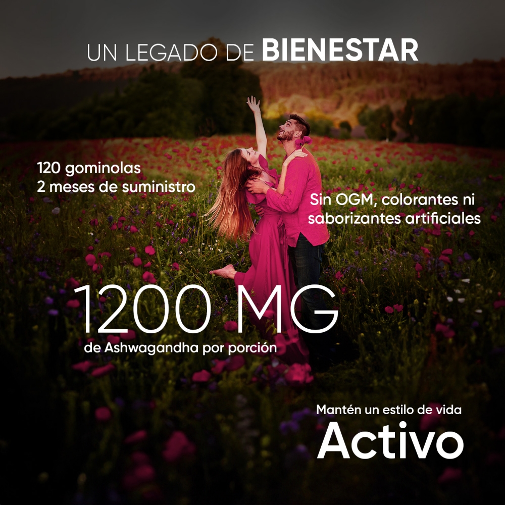 - Potente dosis de 1200 mg de ashwagandha por porción (2 gummies/día)