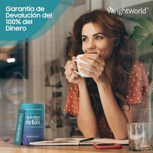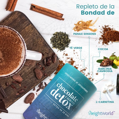 El batido detox de chocolate de WeightWorld trabaja para purificar suavemente su sistema gracias a su fórmula de superalimento natural y nutritivo. Todos los días estamos expuestos a numerosos contaminantes dañinos y productos químicos no deseados a través de los alimentos que comemos y el aire que respiramos, por lo que de vez en cuando nuestro cuerpo se siente hinchado, pesado y cansado y necesitamos una ayuda adicional para sentirnos vigorizados y frescos de nuevo. Este chocolate caliente detox tiene como objetivo limpiar el cuerpo de estas impurezas y, al mismo tiempo, ayudar a controlar el apetito para que puedas cuidar tu cuerpo de una manera agradable.