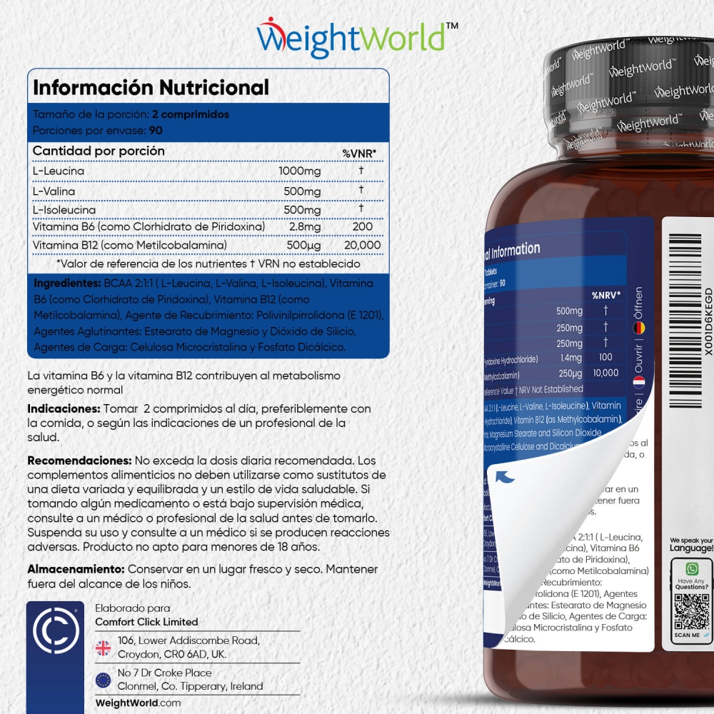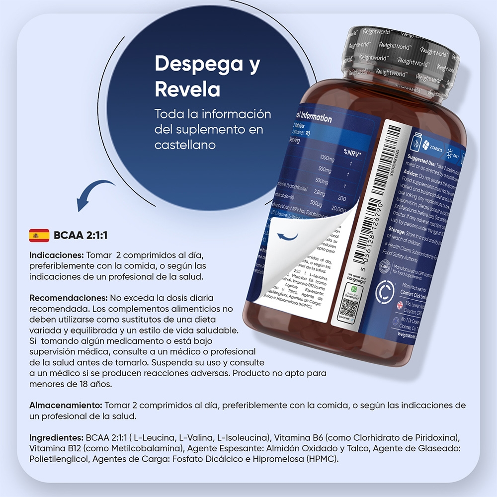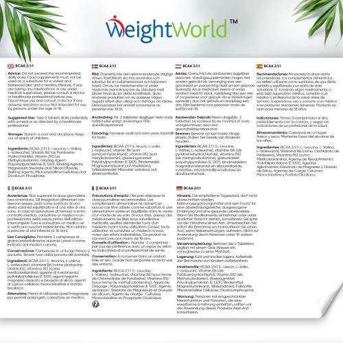 BCAA 2:1:1 (L-leucina, L-valina, L-isoleucina), Vitamina B6 (como Clorhidrato de Piridoxina), Vitamina B12 (como Metilcobalamina), Agente de carga: Celulosa microcristalina, Antiaglomerante: Dióxido de Silicio.