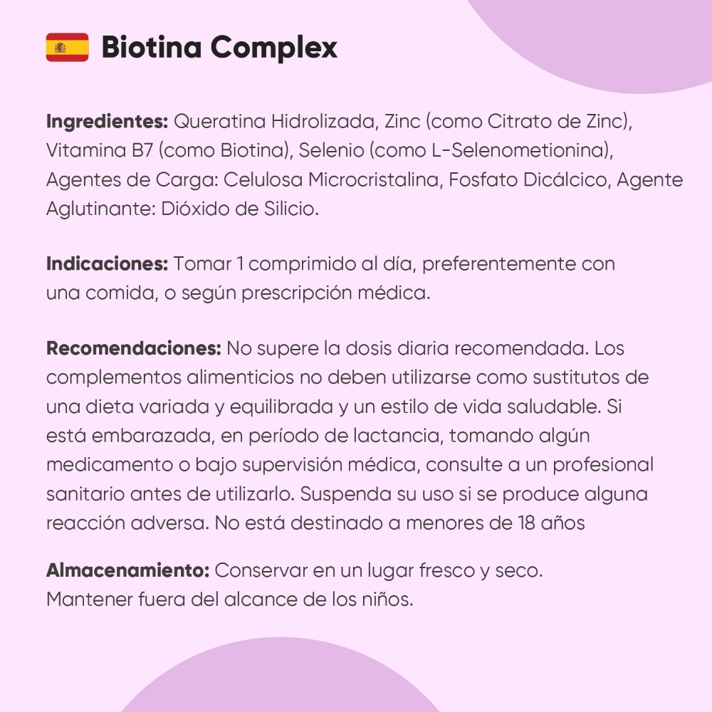 La solución es nuestra Biotina Complex, que combina las propiedades de la biotina con las bondades de la queratina, el selenio y el zinc. A medida que se envejece, se reduce la producción de queratina, una proteína esencial para el mantenimiento, brillo y elasticidad del cabello. Estas pastillas de biotina para el pelo, así, incorporan una potente dosis de queratina (25 mg por comprimido), así como selenio (55 mcg) y zinc (15 mg) para ayudarte a combatir el estrés oxidativo*.