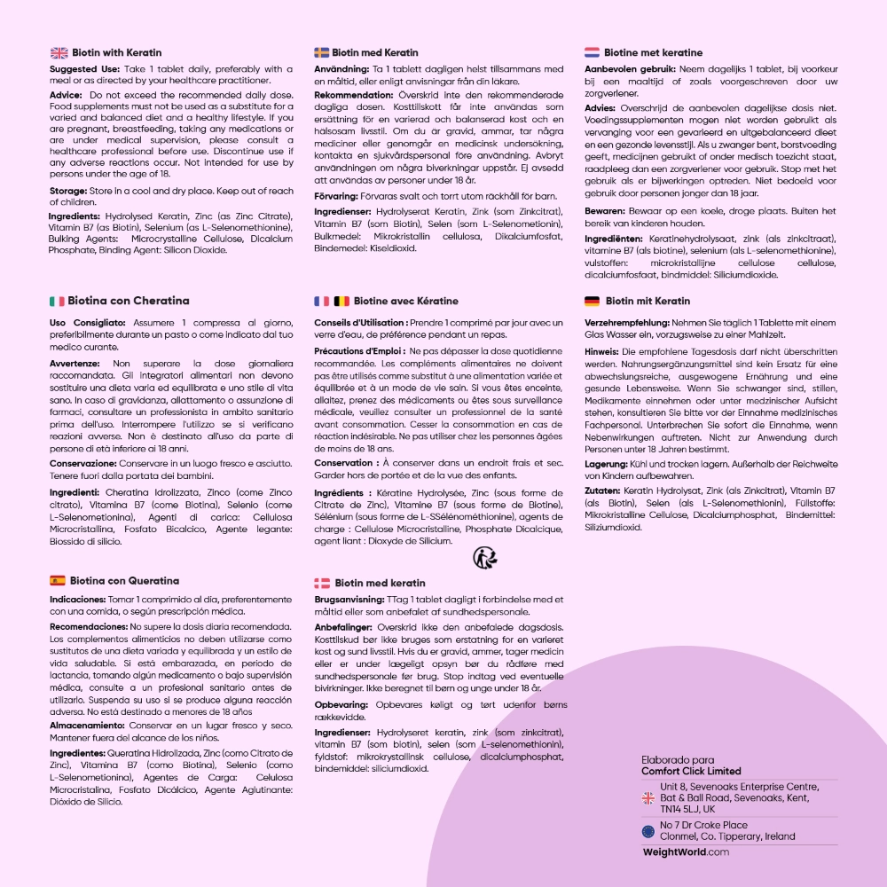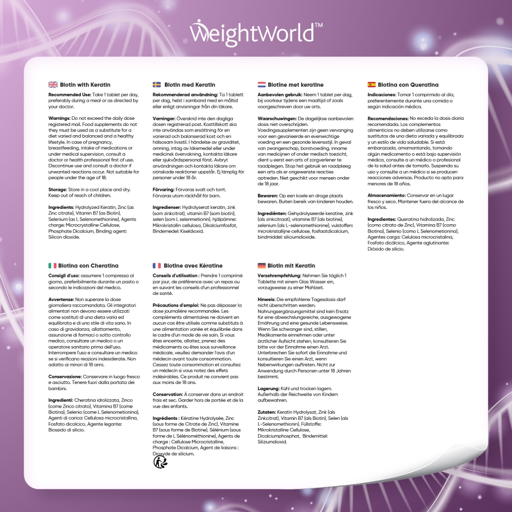 Los comprimidos de biotina con queratina, selenio y zinc vienen avalados por WeightWorld, tu marca de confianza presente en el mercado desde el año 2006. Descubre las cualidades que hacen único a este complemento alimenticio.