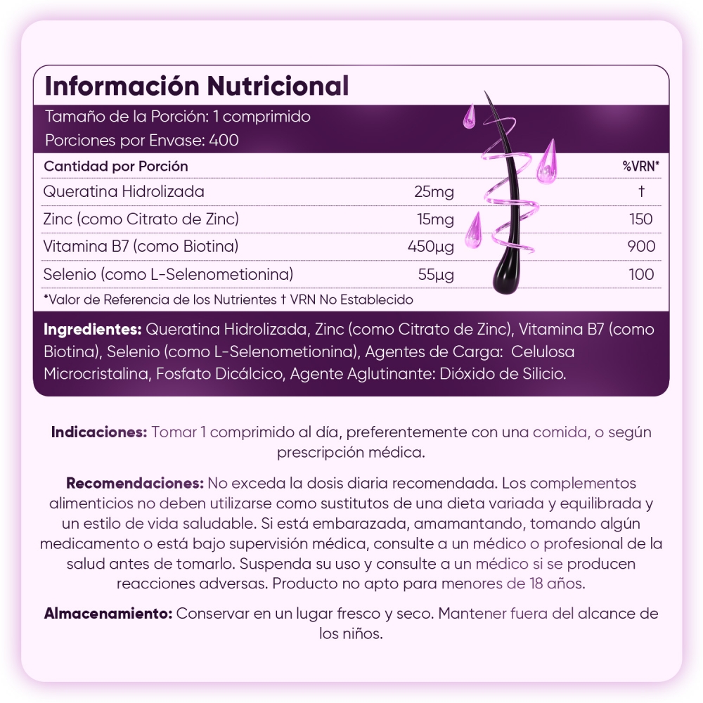 Cada envase de nuestro suplemento de biotina, zinc, selenio y queratina contiene un total de 400 comprimidos que garantizan más de 1 año de suministro. Disfruta de la poderosa dosis de 450 mcg de biotina por tableta en un complemento alimenticio apto para veganos, sin estearato de magnesio y sin OGM.