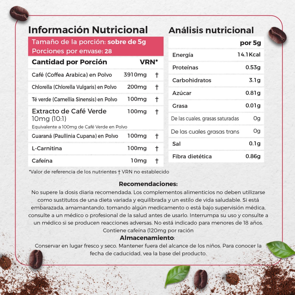 Café (Coffea Arabica) en Polvo, Chlorella (Chlorella Vulgaris) en Polvo, Té Verde (Camellia Sinensis) en Polvo, Extracto de Café Verde (Coffea Arabica) (10:1), Guaraná (Paullinia Cupana) en Polvo, L-Carnitina, Cafeína, Agente de Carga: Maltodextrina.