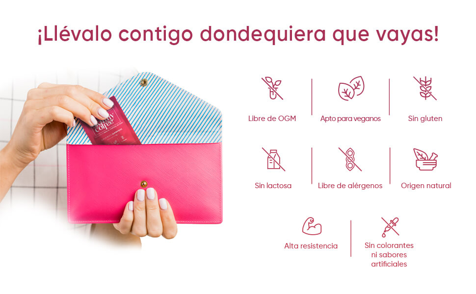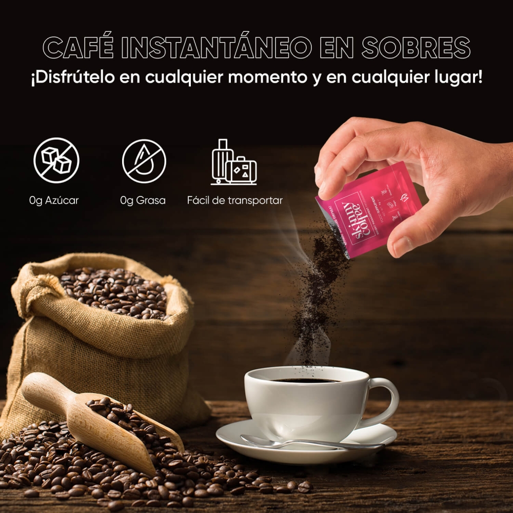Este slim coffee incluye 28 bolsitas con 5 g de esta poderosa mezcla por porción. Se trata de un complemento alimenticio apto para dietas keto y para veganos y vegetarianos. Está libre de gluten y OGM.
