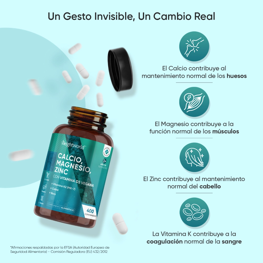 Combinar calcio, magnesio, zinc y vitamina D3 en un solo suplemento es una forma práctica de aportar a tu cuerpo nutrientes clave en su día a día. Cada uno cumple una función específica, y juntos trabajan en armonía para apoyar diferentes procesos del organismo. Veamos sus beneficios respaldados por la Autoridad Europea de Seguridad Alimentaria.