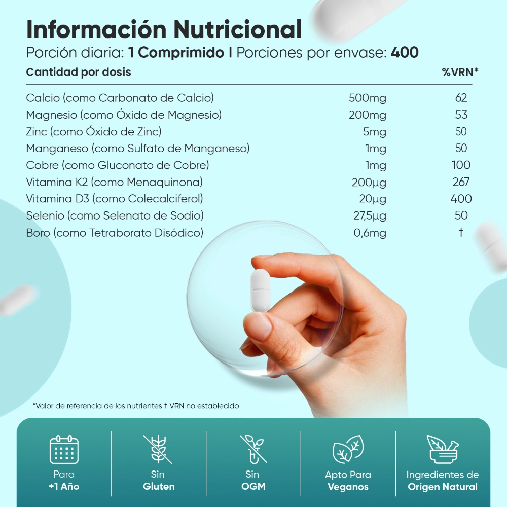 Este suplemento alimenticio contiene 7 minerales y 2 vitaminas esenciales, entre los que encontramos Boro, Selenio, Vitamina K, Cobre y Manganeso. Cada envase incluye 400 comprimidos, lo que equivale a más de un año de suministro, para que no tengas que preocuparte de reponerlo constantemente. Su formato en comprimidos fáciles de tomar hace que incorporarlo a tu rutina sea muy sencillo. Además, es apto para vegetarianos, sin gluten ni OGM, pensado para adaptarse a diferentes estilos de vida.