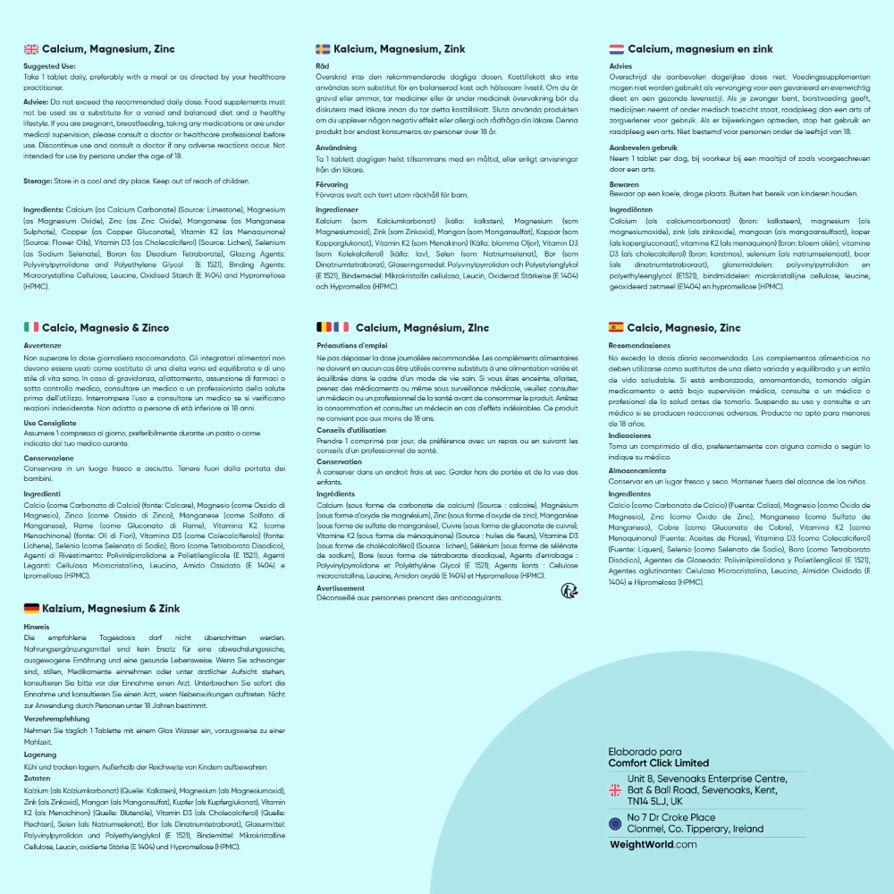 Calcio, Magnesio y Zinc con Vitamina D3 de WeightWorld es un suplemento que combina tres de los minerales más relevantes junto con vitamina D3. Aunque todos ellos están presentes en una gran variedad de alimentos, alcanzar la ingesta diaria adecuada puede ser complicado debido al ritmo de vida actual o a dietas específicas. Nuestros comprimidos, fáciles de tomar y con una fórmula pensada para uso diario, te ofrecen una forma práctica de complementar tu alimentación y seguir con tu rutina sintiéndote respaldado desde dentro.