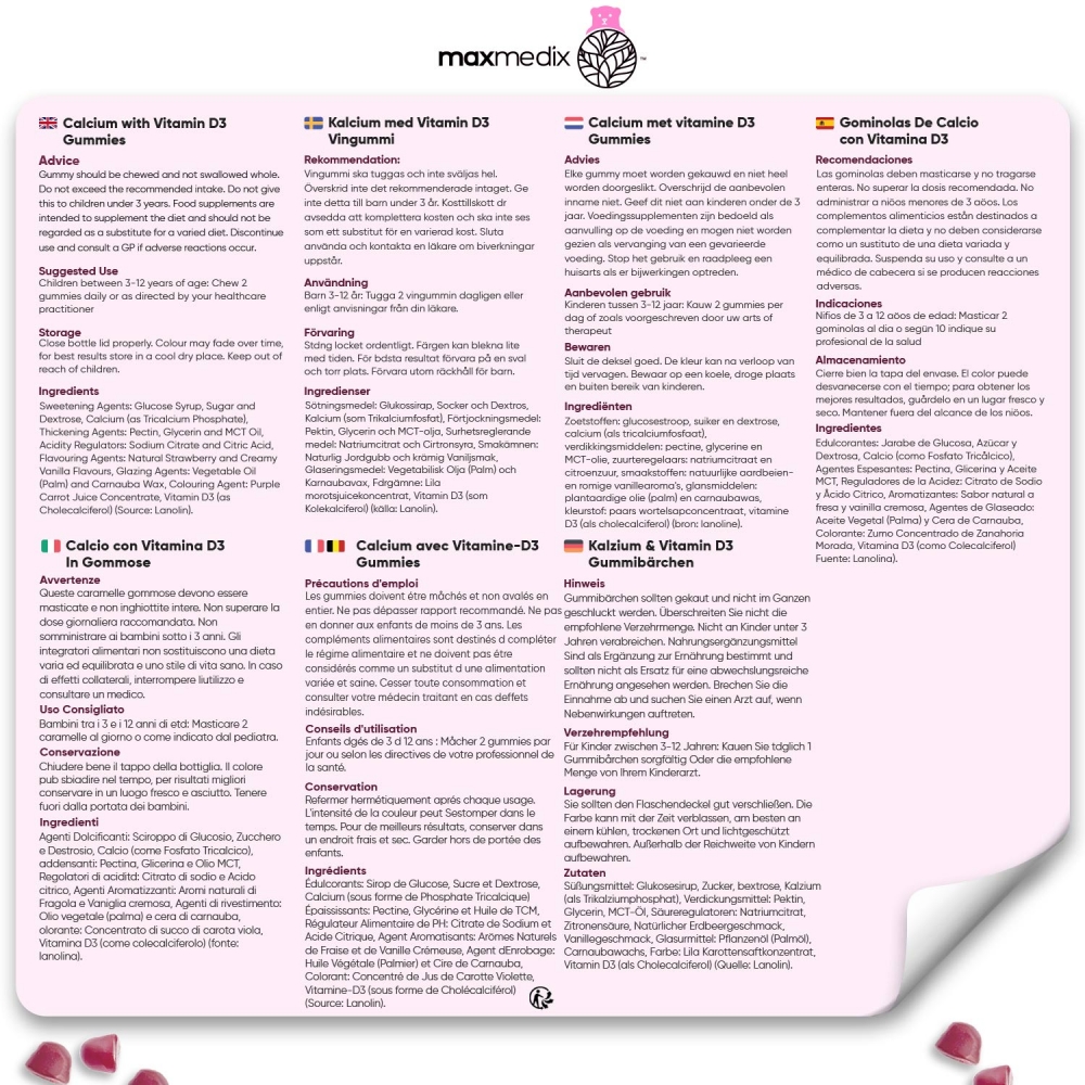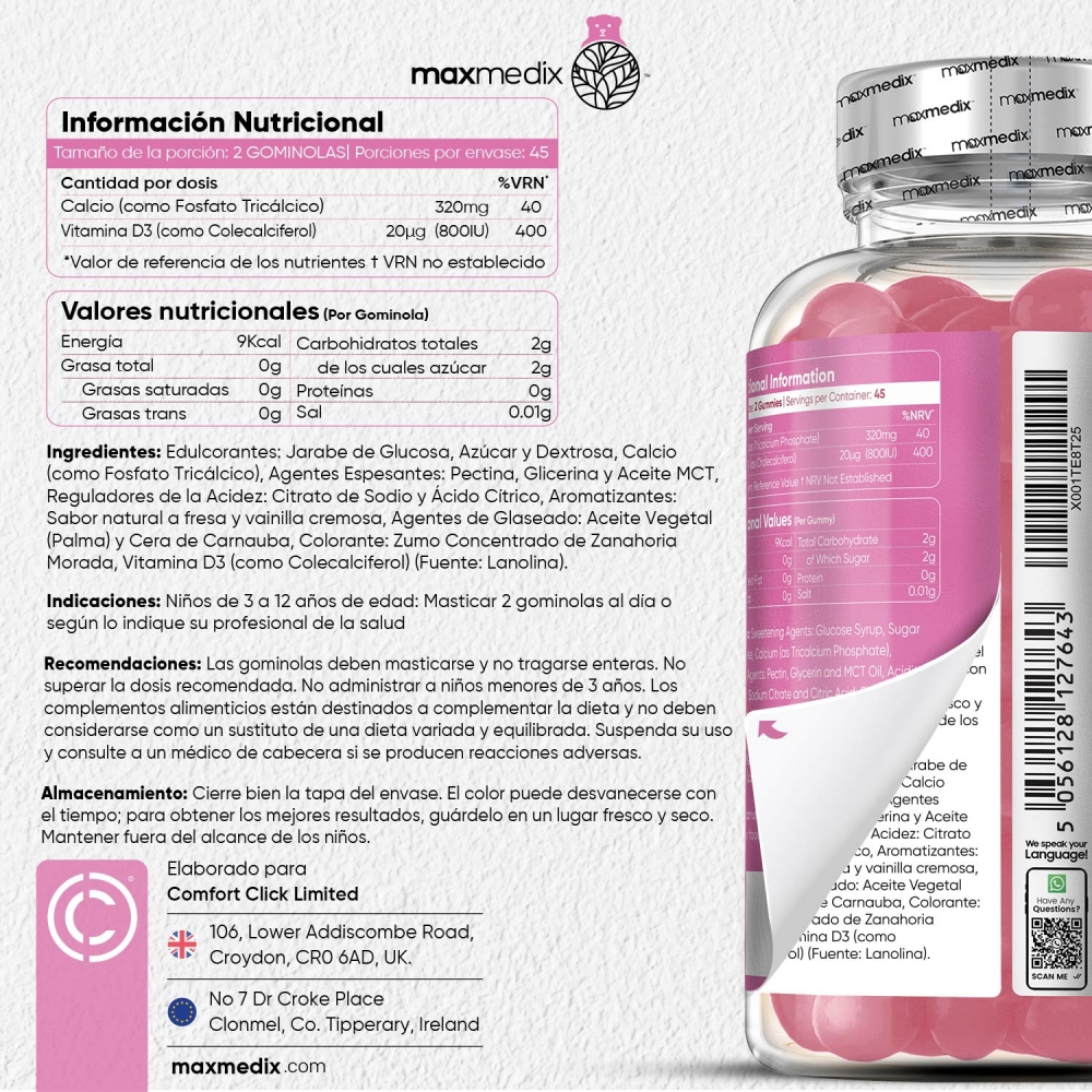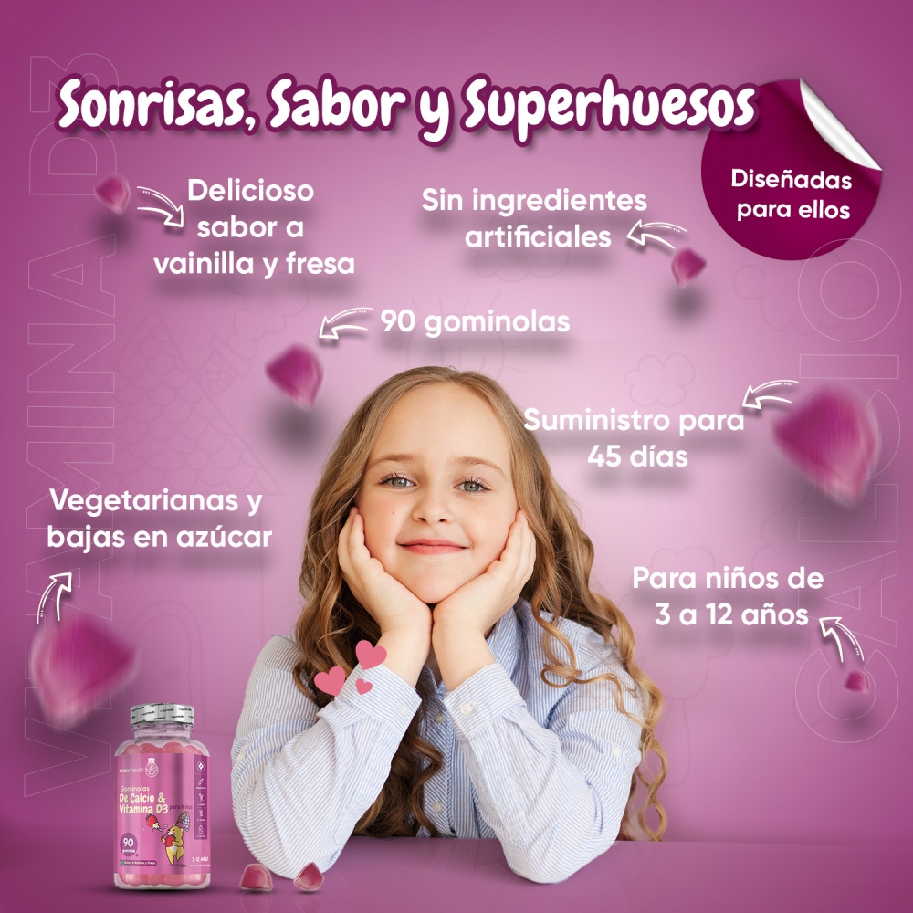 El calcio juega un rol muy importante en la formación y desarrollo de los huesos y los dientes, de ahí la necesidad de asegurar que este mineral esté presente en la dieta de los niños. La leche es una de las fuentes más poderosas de calcio, si bien los peques no suelen ser entusiastas de este alimento. Entonces, ¿cómo suministrar calcio a niños que no toman leche? La respuesta está en estas Gominolas de Calcio y Vitamina D3 para niños de Maxmedix, complemento alimenticio que contiene una interesante cantidad de este mineral.