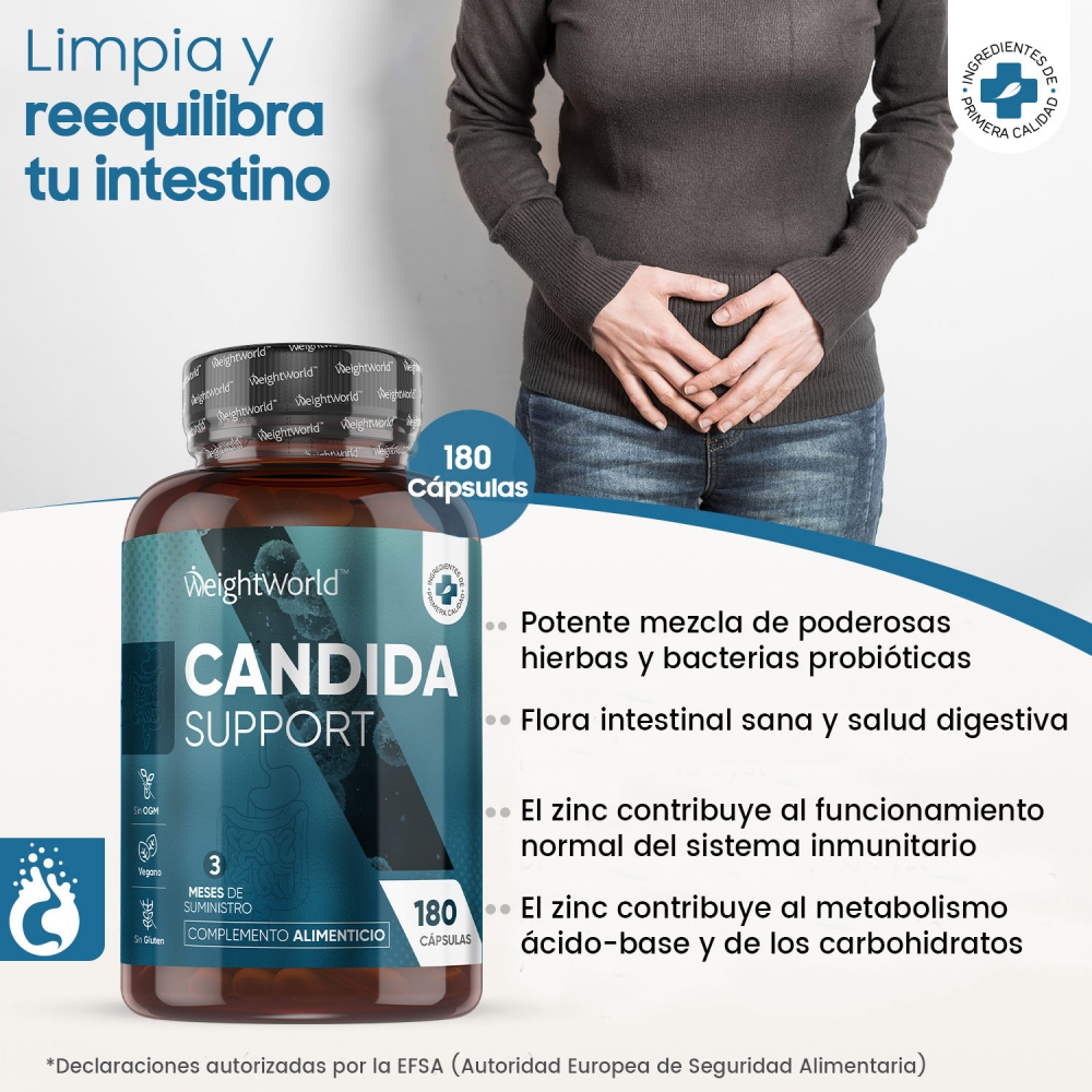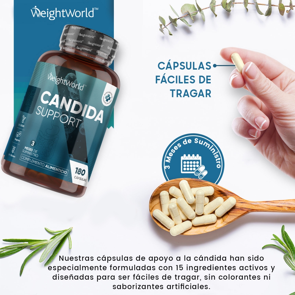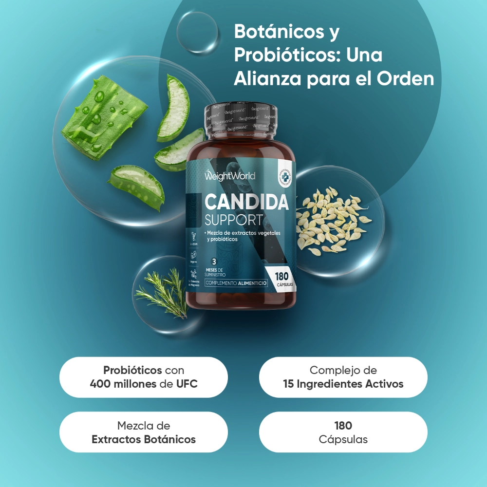 El suplemento Candida Support de WeightWorld ha sido desarrollado para acompañar tu rutina de bienestar intestinal e íntimo. Esta fórmula combina probióticos como Lactobacillus Acidophilus y Bifidobacterium Bifidum con una mezcla de ingredientes botánicos cuidadosamente seleccionados, como ácido caprílico, aloe vera, romero, ajo, canela, tomillo y orégano, tradicionalmente utilizados para apoyar la digestión y las defensas del organismo.