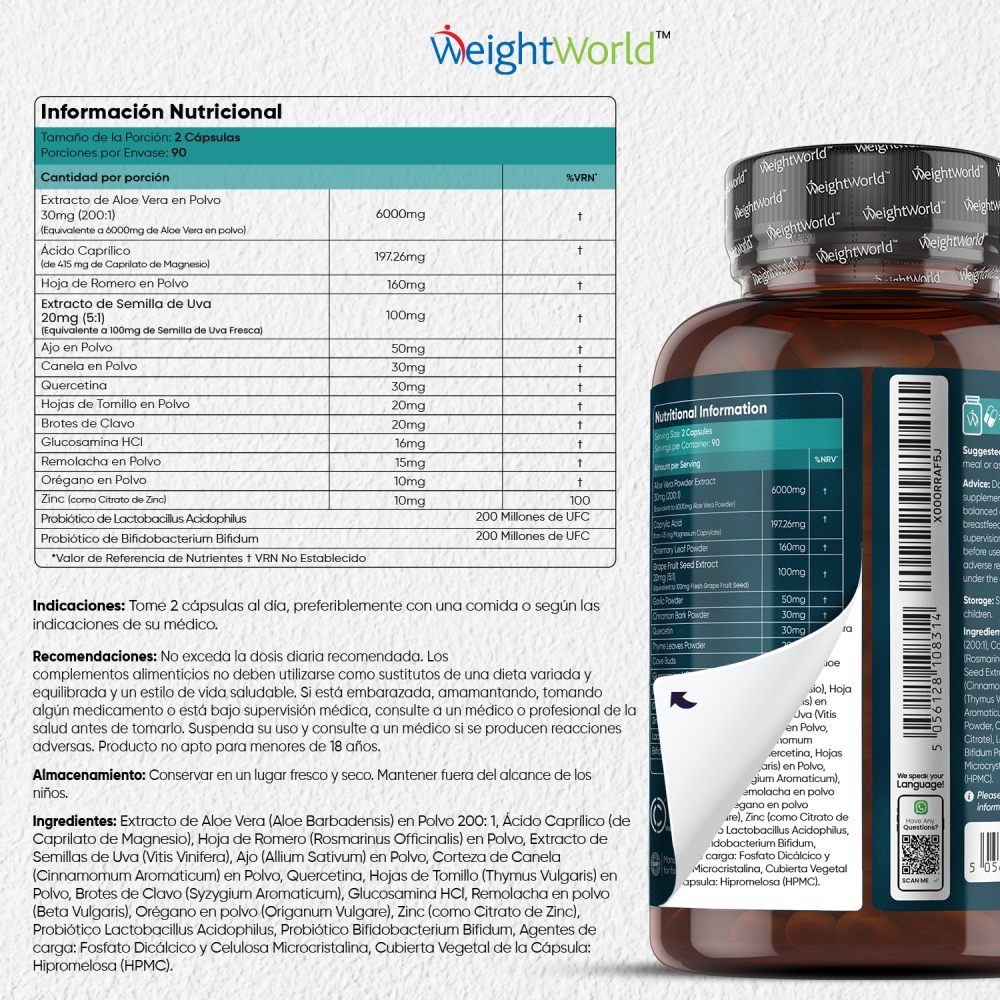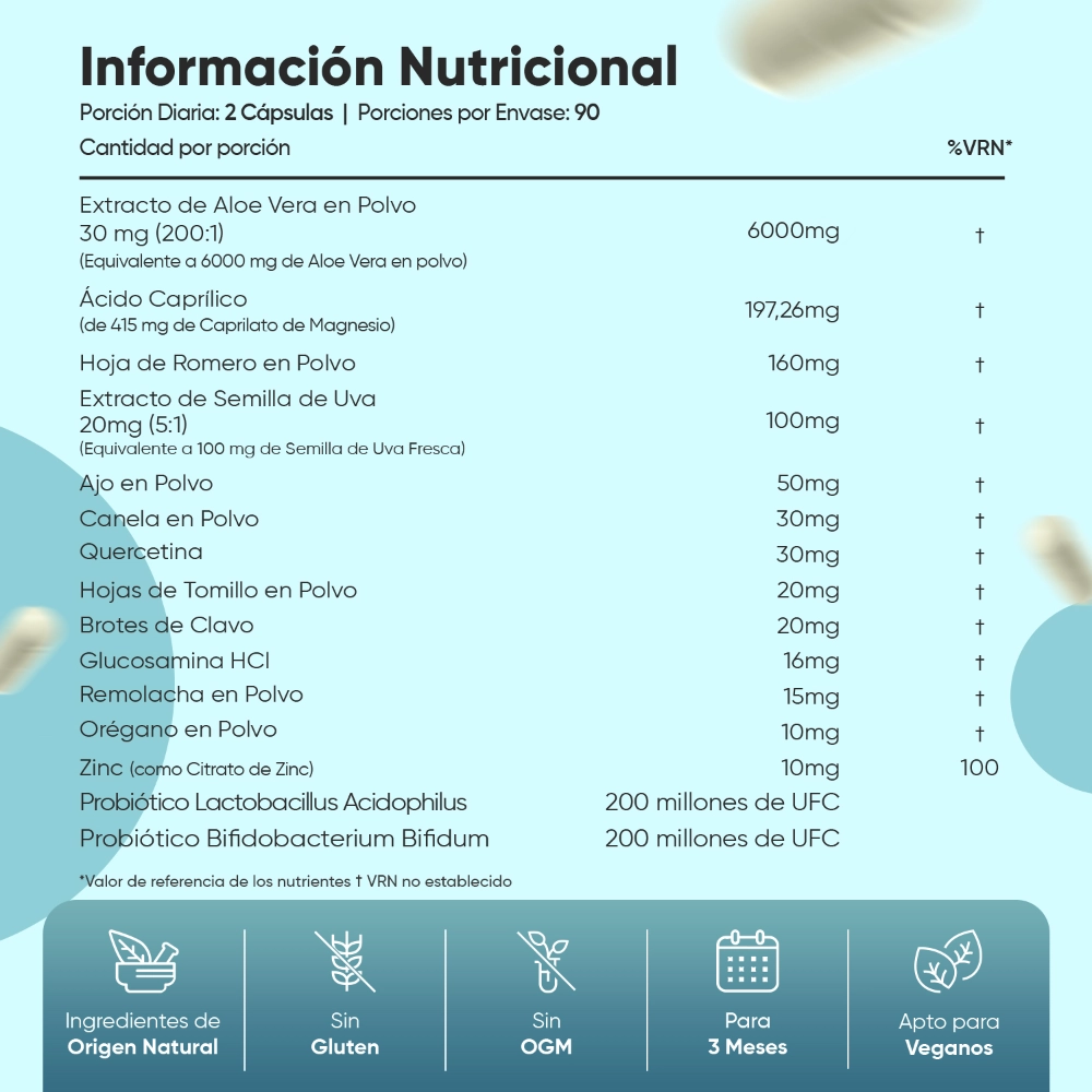 Extracto de Aloe Vera (Aloe Barbadensis) en Polvo 200: 1, Ácido Caprílico (de Caprilato de Magnesio), Hoja de Romero (Rosmarinus Officinalis) en Polvo, Extracto de Semillas de Pomelo (Vitis Vinifera), Ajo (Allium Sativum) en Polvo, Corteza de Canela (Cinnamomum Aromaticum) en Polvo, Quercetina, Hojas de Tomillo (Thymus Vulgaris) en Polvo, Brotes de Clavo (Syzygium Aromaticum), Glucosamina HCI, Remolacha en polvo (Beta Vulgaris), Orégano en polvo (Origanum Vulgare), Zinc (como Citrato de Zinc), Probiótico Lactobacillus Acidophilus, Probiótico Bifidobacterium Bifidum, Agentes de carga: Fosfato Dicálcico y Celulosa Microcristalina, Cubierta Vegetal de la Cápsula: Hipromelosa (HPMC).