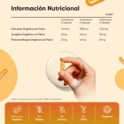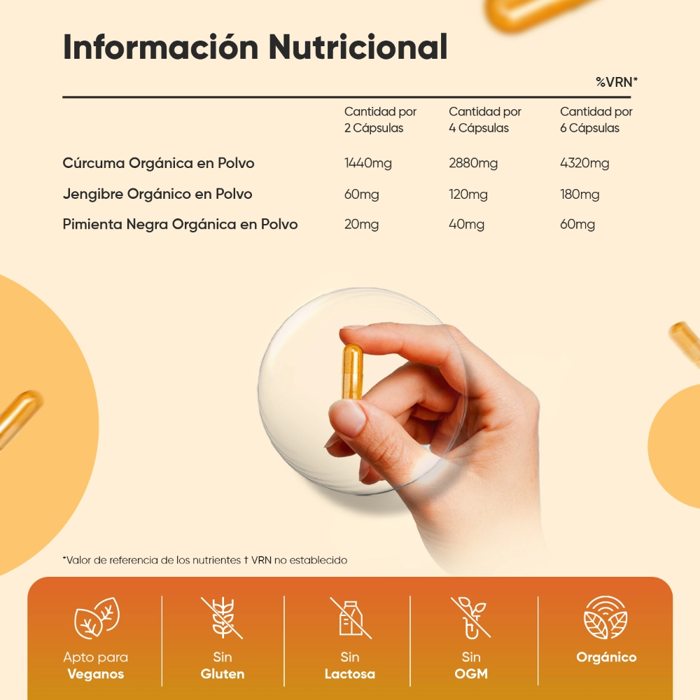 Cúrcuma Orgánica en polvo (Curcuma Longa), Jengibre Orgánico en polvo (Zingiber Officinale R.), Pimienta Negra Orgánica en polvo (Piper Nigrum L.), Cubierta Vegetal de la Cápsula#: Hipromelosa (HPMC).