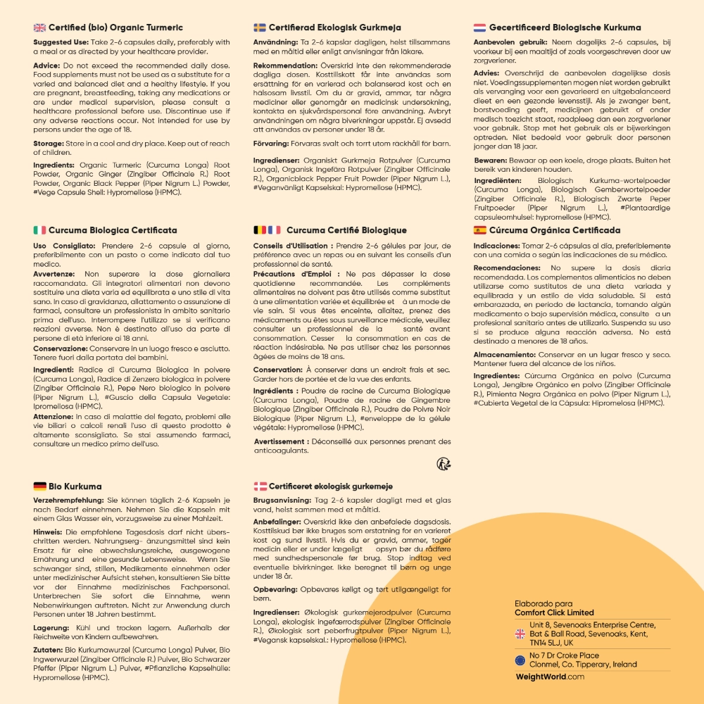 La curcumina en cápsulas de WeightWorld se acompaña de jengibre y pimienta negra, dos ingredientes que complementan los beneficios de la cúrcuma. El resultado es un suplemento ecológico y potente que aporta una dosis de 1520 mg por porción (2 cápsulas al día). Cada envase contiene 180 cápsulas para un suministro de 3 meses.
