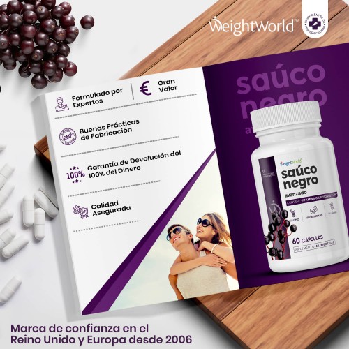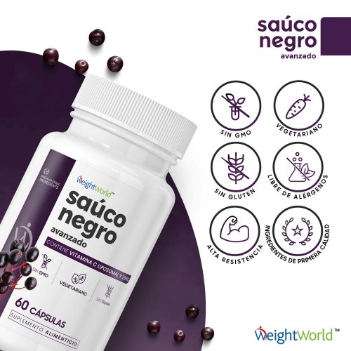 ¿Busca un suplemento de saúco negro de alta resistencia para aumentar la vitalidad y el bienestar? WeightWorld le ofrece una fórmula avanzada de bayas de saúco de alta potencia y calidad superior que contiene una poderosa mezcla de vitamina C liposomal y zinc en cada porción. Solo una cápsula fácil de tragar al día para que pueda mantenerse con energía y aumentar la inmunidad de su cuerpo todos los días.