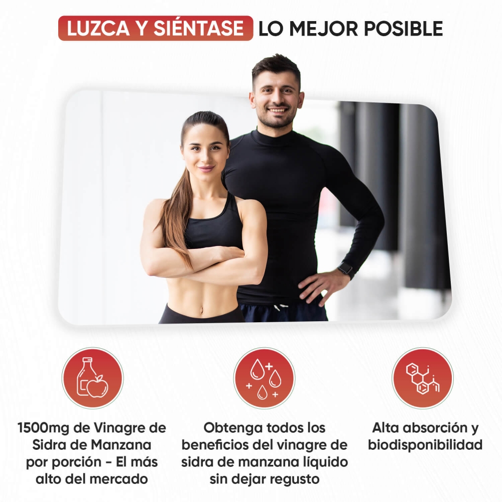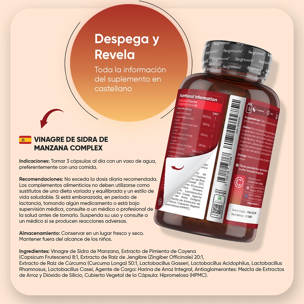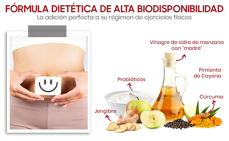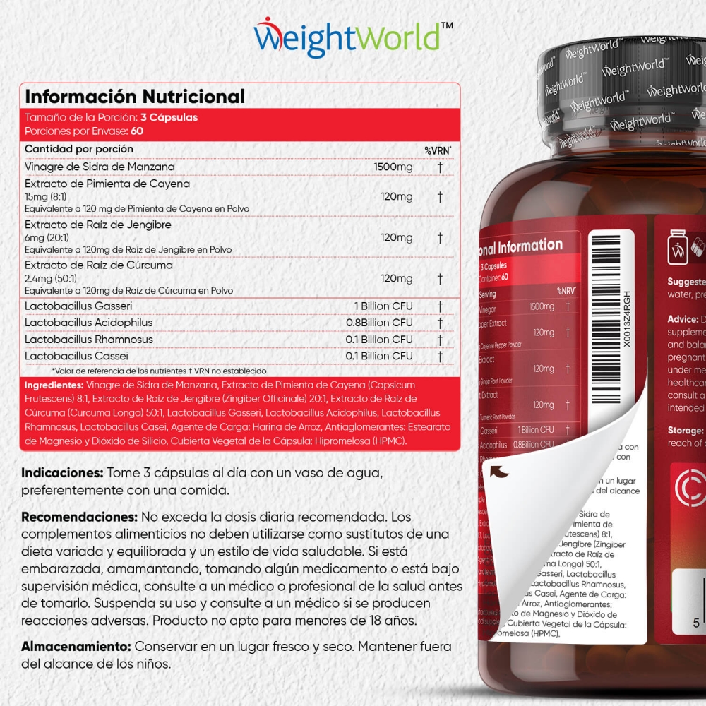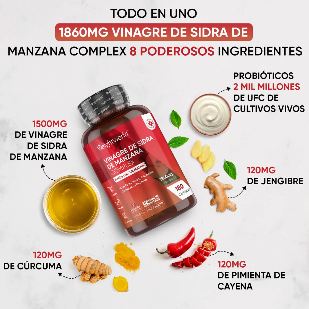 Vinagre de Sidra de Manzana, Extracto de Pimienta de Cayena (Capsicum Frutescens) 8:1, Extracto de Raíz de Jengibre (Zingiber Officinale) 20:1, Extracto de Raíz de Cúrcuma (Curcuma Longa) 50:1, Lactobacillus Gasseri, Lactobacillus Acidophilus, Lactobacillus Rhamnosus, Lactobacillus Casei, Agente de Carga: Harina de Arroz Integral, Antiaglomerantes: Mezcla de Extractos de Arroz y Dióxido de Silicio, Cubierta Vegetal de la Cápsula: Hipromelosa (HPMC).