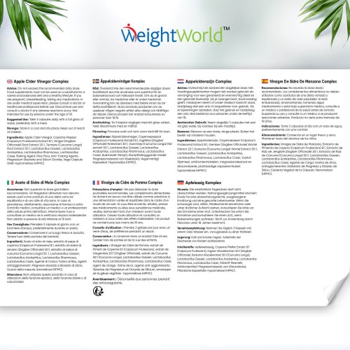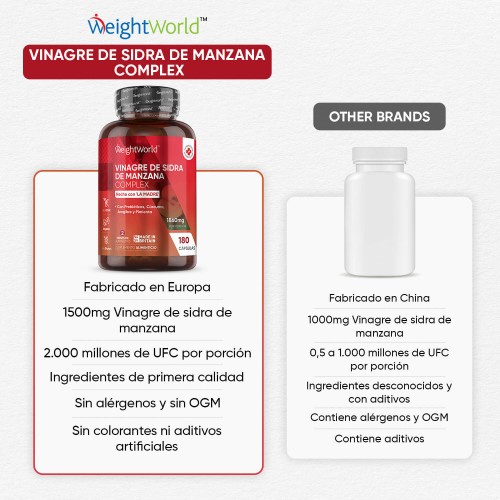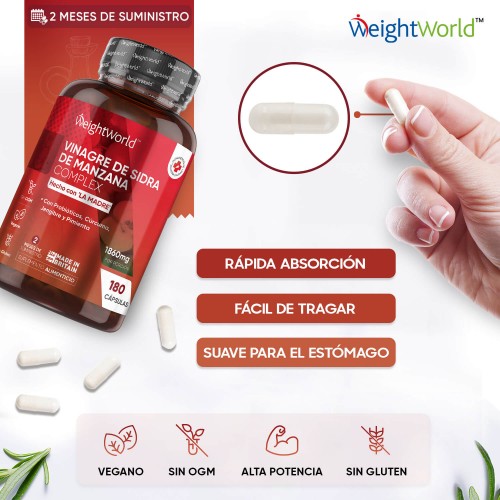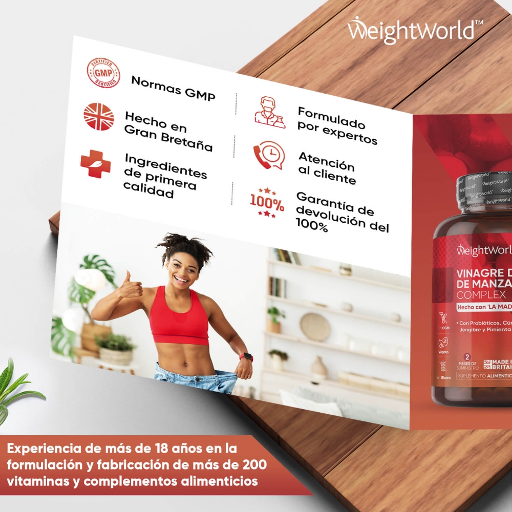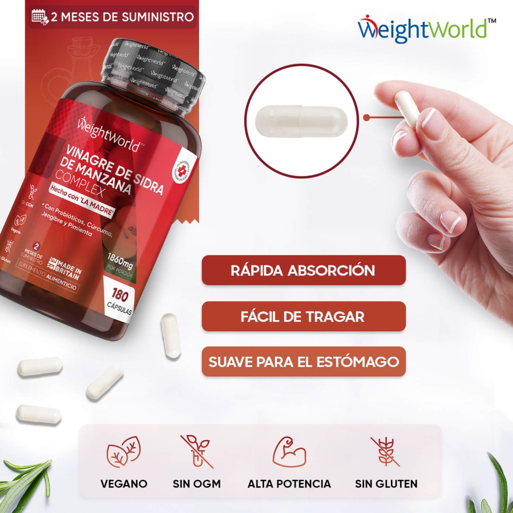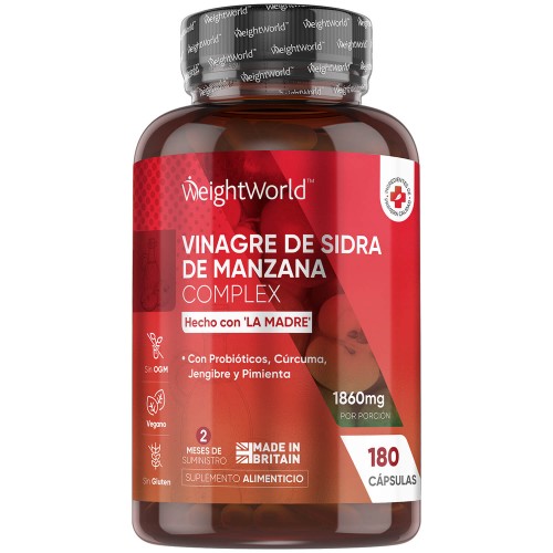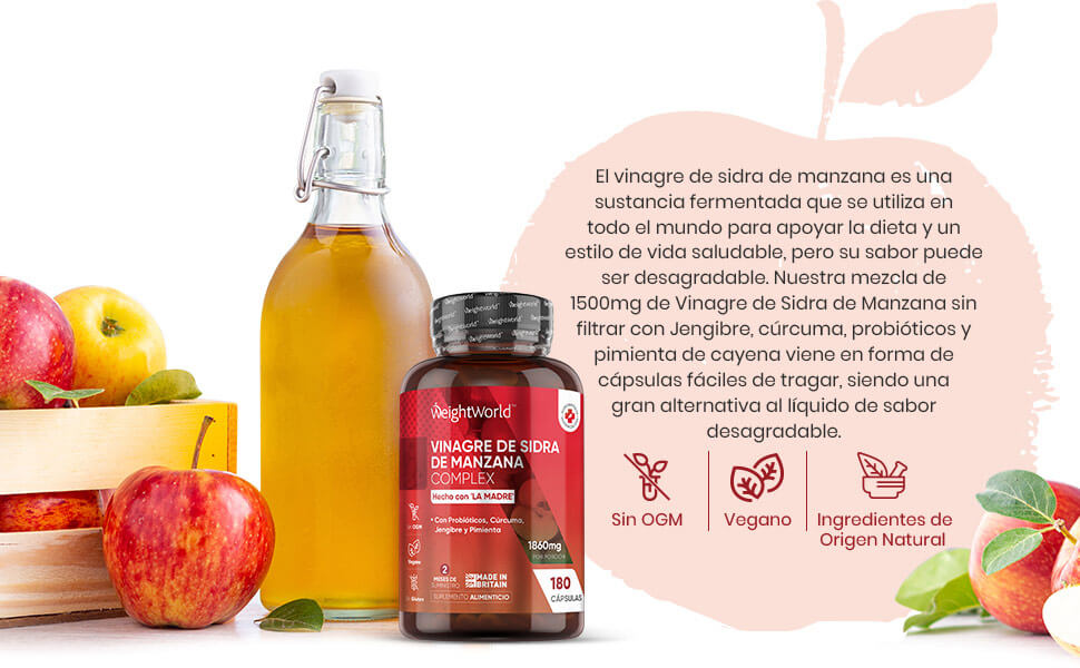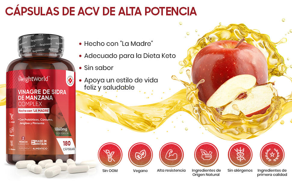 Vinagre de Sidra de Manzana, Extracto de Pimienta de Cayena (Capsicum Frutescens) 8:1, Extracto de Raíz de Jengibre (Zingiber Officinale) 20:1, Extracto de Raíz de Cúrcuma (Curcuma Longa) 50:1, Lactobacillus Gasseri, Lactobacillus Acidophilus, Lactobacillus Rhamnosus, Lactobacillus Casei, Agente de Carga: Harina de Arroz Integral, Antiaglomerantes: Mezcla de Extractos de Arroz y Dióxido de Silicio, Cubierta Vegetal de la Cápsula: Hipromelosa (HPMC).