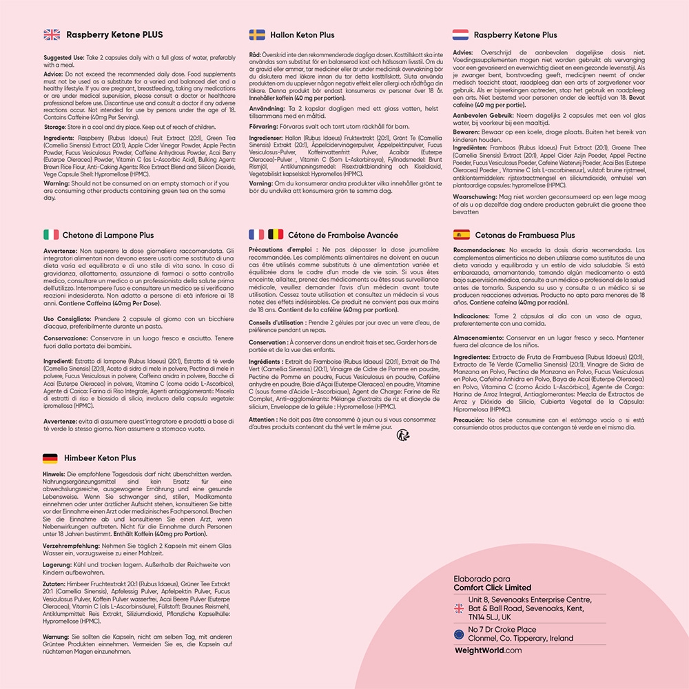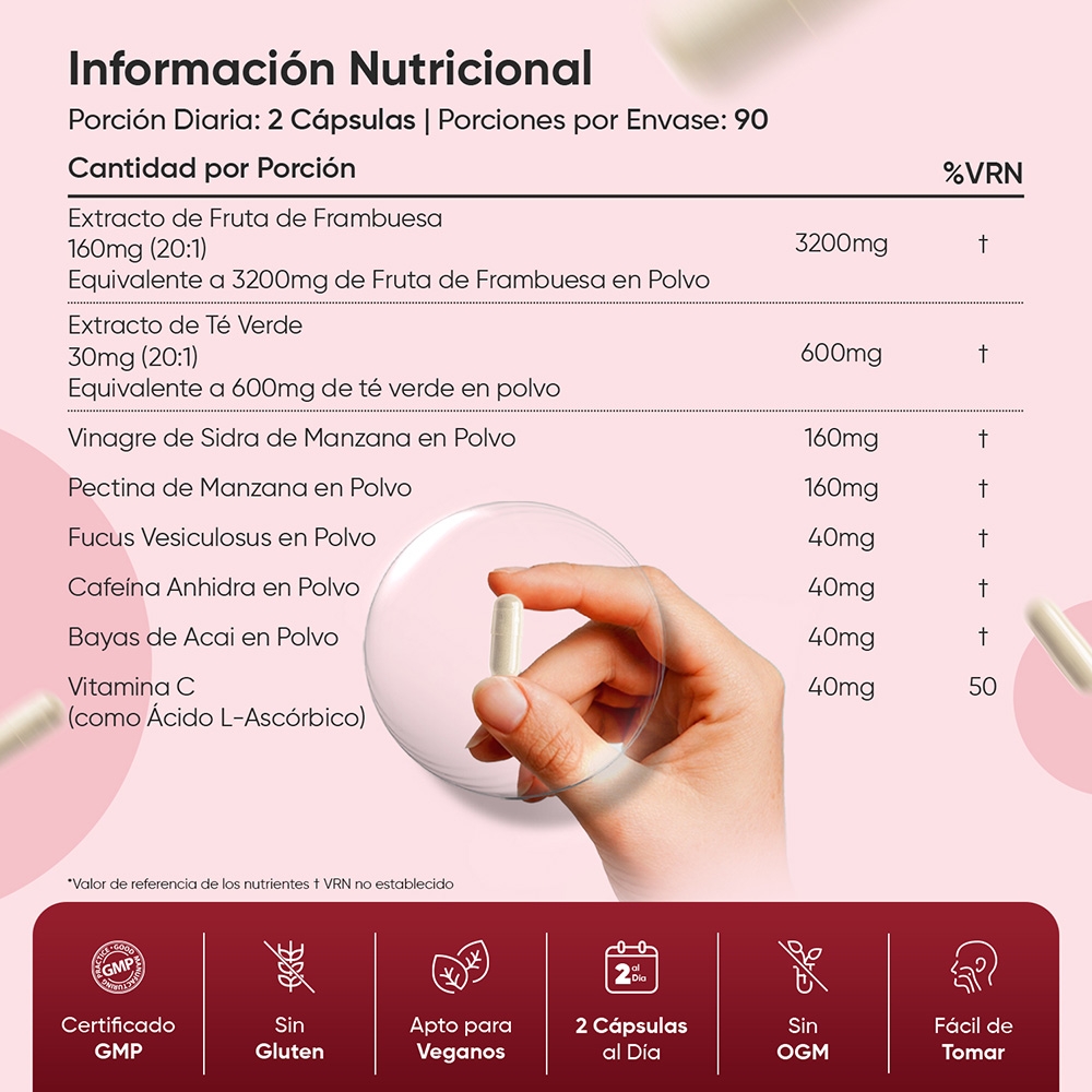 Extracto de Fruta de Frambuesa (Rubus Idaeus) (20:1), Extracto de Té Verde (Camellia Sinensis) (20:1), Vinagre de Sidra de Manzana en Polvo, Pectina de Manzana en Polvo, Fucus Vesiculosus en Polvo, Cafeína Anhidra en Polvo, Baya de Acai (Euterpe Oleracea) en Polvo, Vitamina C (como Ácido L-Ascórbico), Agente de Carga: Harina de Arroz Integral, Antiaglomerantes: Mezcla de Extractos de Arroz y Dióxido de Silicio, Cubierta Vegetal de la Cápsula: Hipromelosa (HPMC).