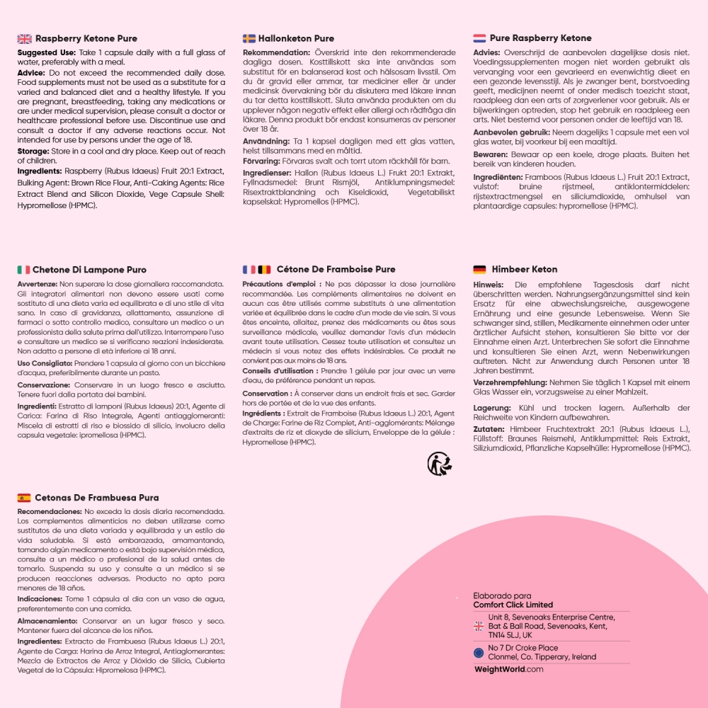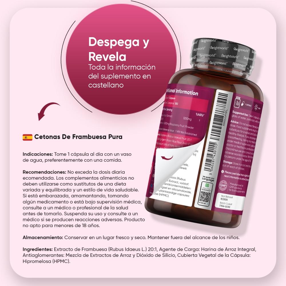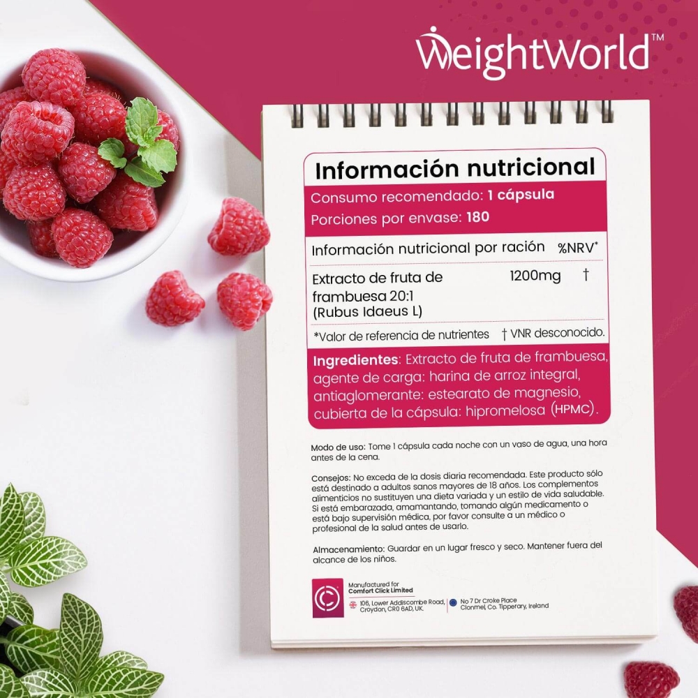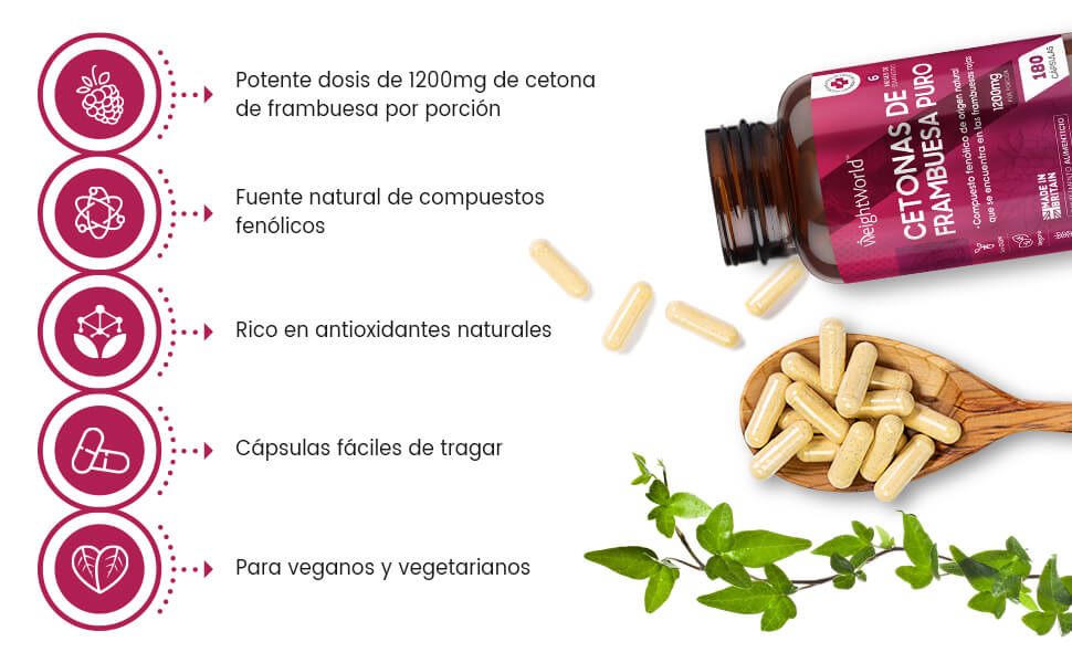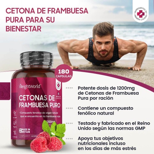 Este producto disponible en WeightWorld proporciona una poderosa dosis de 1200 mg de cetonas de frambuesa por cada cápsula. Para obtener esta cantidad de cetonas de la propia fruta, sería necesario ingerir varios kilogramos. Nuestras cápsulas de Cetonas de Frambuesa son aptas para veganos, no contienen gluten ni OGM. También están exentas de estearato de magnesio. Este suplemento propone un suministro suficiente para 6 meses.