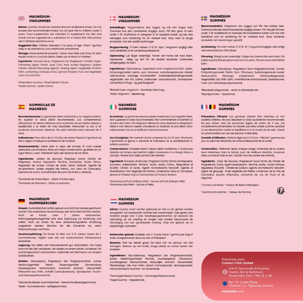 Jarabe de glucosa, Magnesio (como Citrato de Magnesio), Azúcar, Espesante: Pectina, Acidulante: Ácido Cítrico, Regulador de Acidez: Citrato de sodio, Sabor Natural‡, Agente de recubrimiento: Aceite vegetal (de Palma, con Cera de Carnauba), Espinaca en polvo, Concentrado de zumo de frutas y verduras.