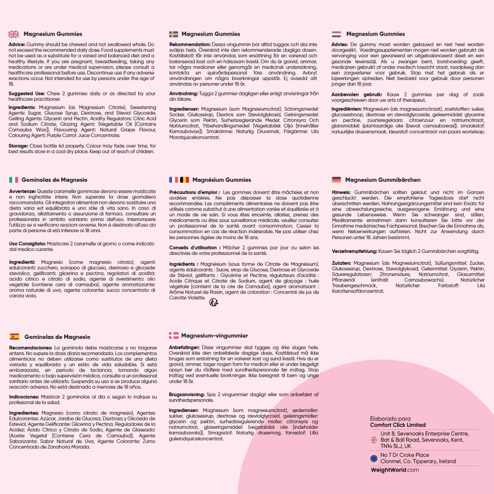 Magnesio (como citrato de magnesio), Agentes Edulcorantes: Azúcar, Jarabe de Glucosa, Dextrosa y Glicósido de Esteviol, Agente Gelificante: Glicerina y Pectina, Reguladores de la Acidez: Ácido Cítrico y Citrato de Sodio, Agente de Glaseado: (Aceite Vegetal [Contiene Cera de Carnauba]), Agente Saborizante: Sabor Natural de Uva, Agente Colorante: Zumo Concentrado de Zanahoria Morada.