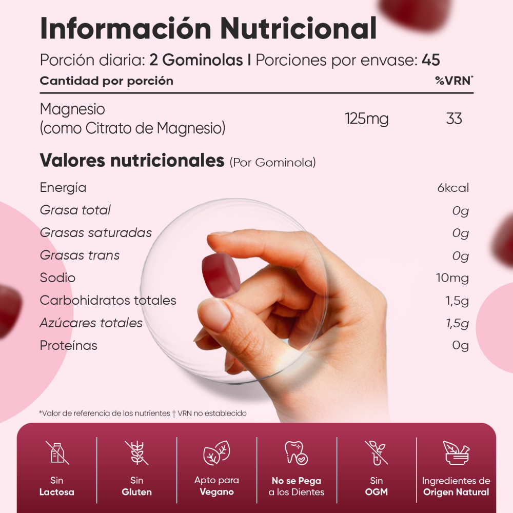 • Potente dosis de 125 mg de magnesio por porción (2 gummies al día)