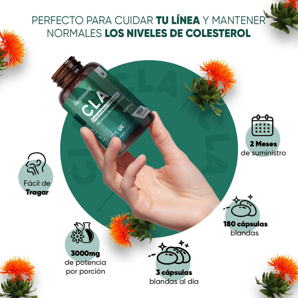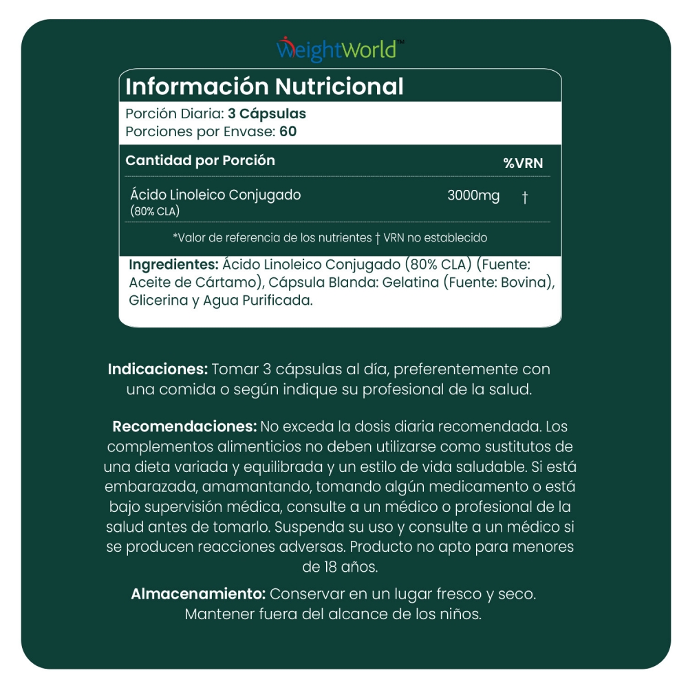 - Potente dosis de 3000 mg de CLA por porción (3 cápsulas/día)