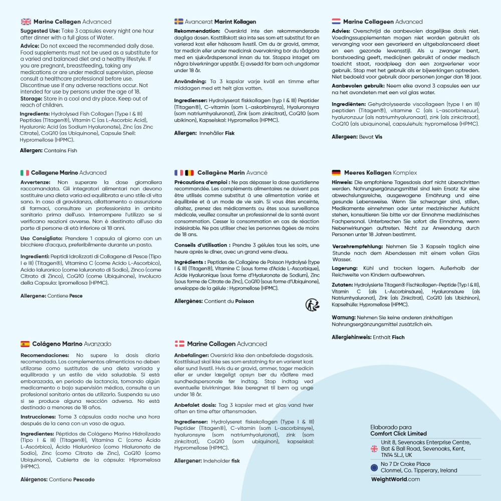 Este suplemento de Colágeno con Ácido Hialurónico y otros ingredientes trae 120 cápsulas. La dosis diaria supone la ingesta de tres cápsulas de Colágeno Marino Avanzado, por lo que dispondrás de un suministro suficiente para 40 días. Nuestro suplemento no contiene lactosa ni gluten ni OGM y ha sido elaborado en Reino Unido. Está libre de estearato de magnesio.