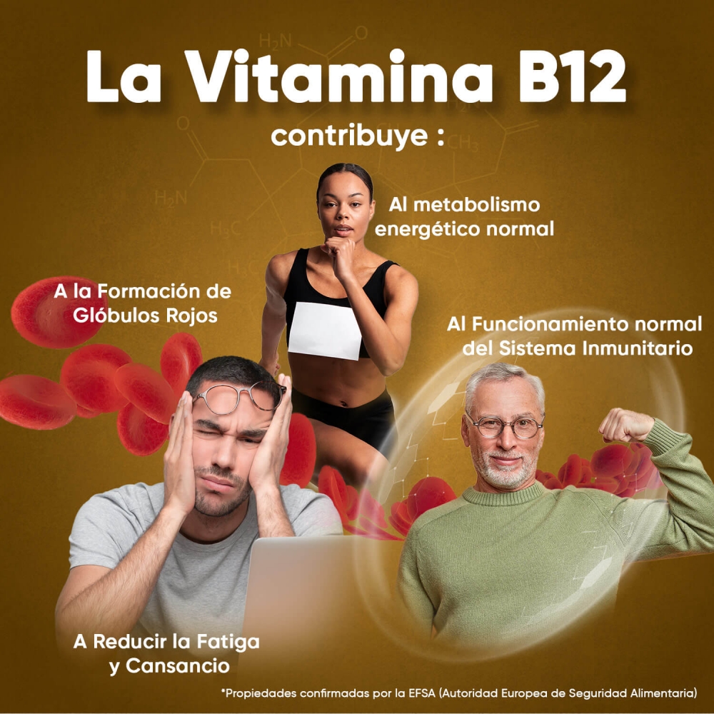Nuestro suplemento de vitamina B12 es un aliado ideal para complementar tu alimentación. Además, la vitamina B12 ofrece muchos otros beneficios avalados por la Autoridad Europea de Seguridad Alimentaria (EFSA):