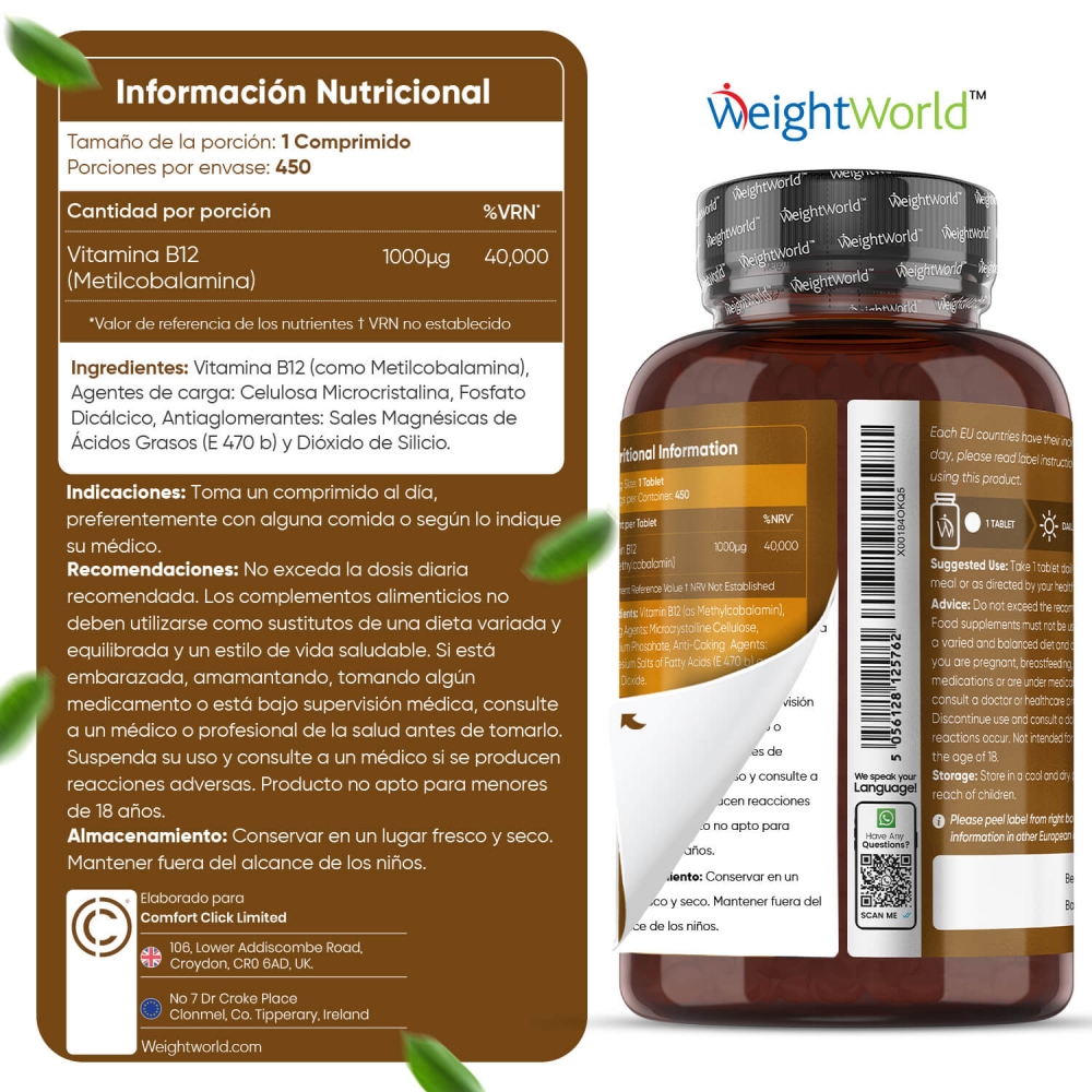 1000 mcg 450 comprimidos | Suplemento Vegano para Aumentar el Bienestar y la Energía