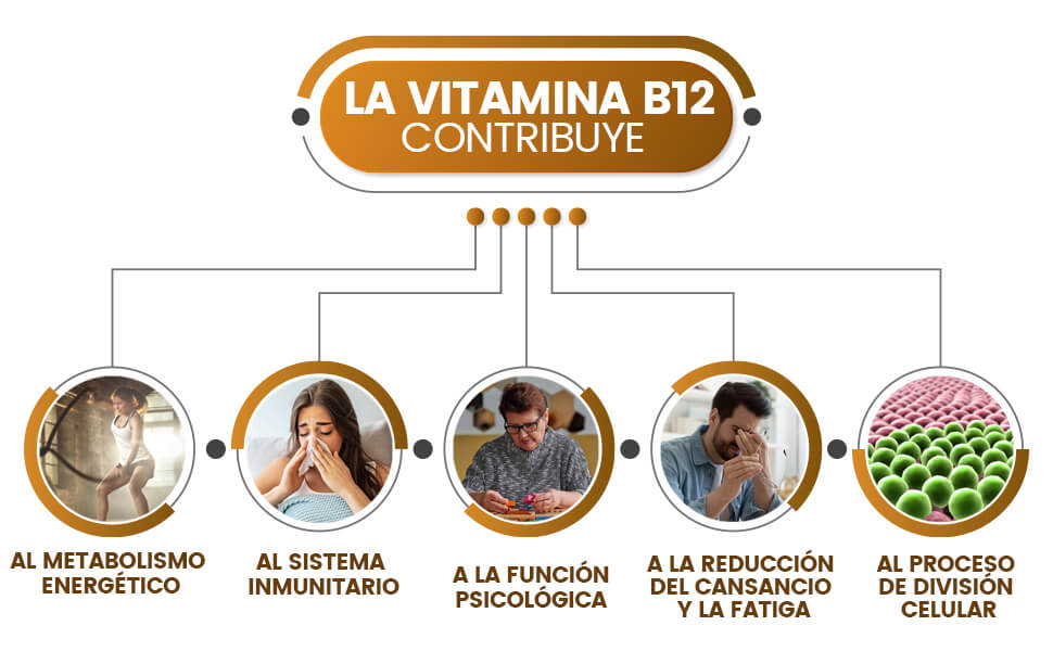 - La vitamina B12 contribuye al metabolismo energético normal*