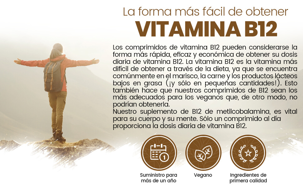 Nuestro suplemento de Vitamina B12 viene en comprimidos fáciles de ingerir y 100 % aptos para veganos. Cada comprimido contiene metilcobalamina pura con una potente dosis de 1000 mcg por pastilla. Con 450 comprimidos en cada bote, tendrás más de un año de suministro y, de este modo, evitarás el déficit de vitamina B12 en tu organismo.