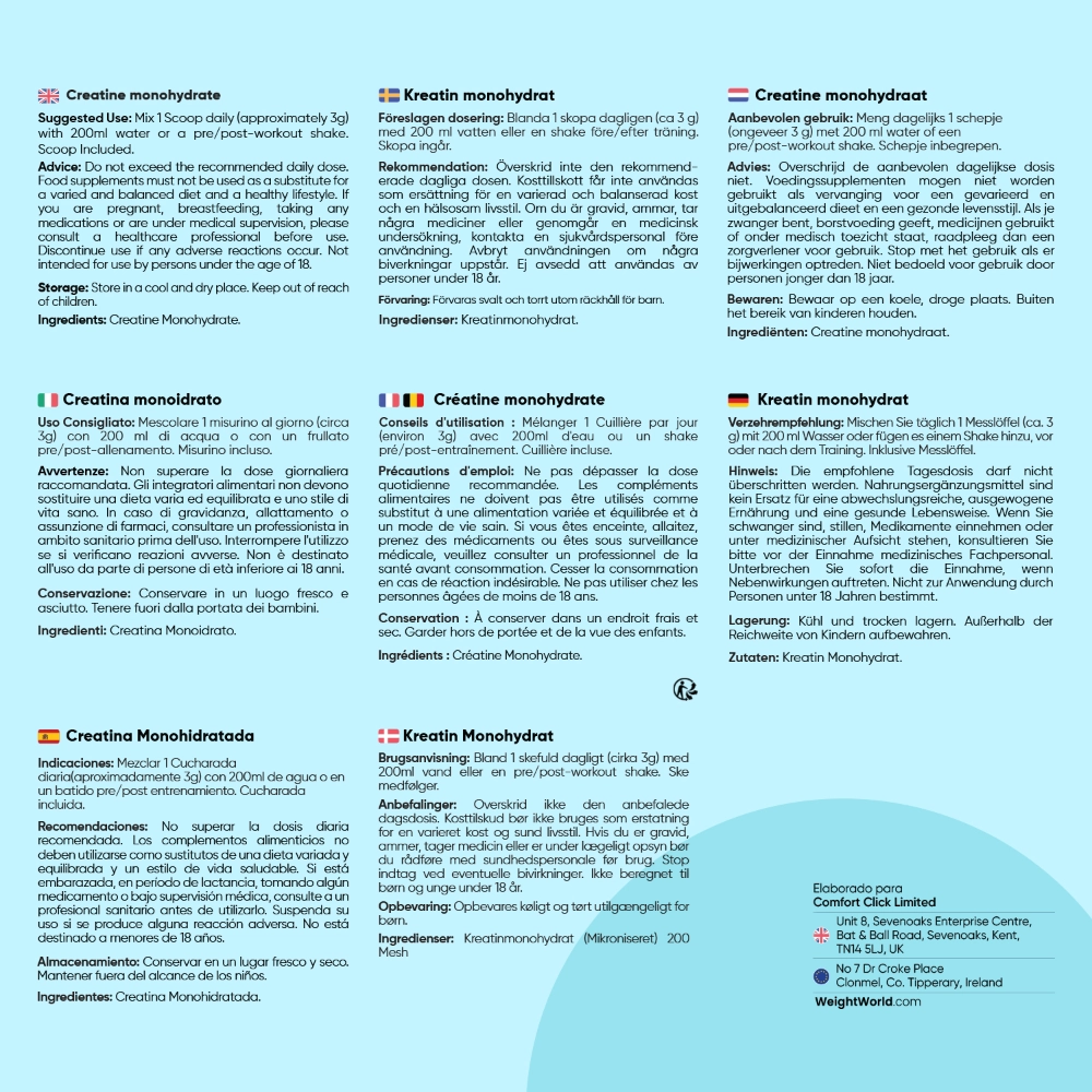 La Creatina Monohidrato en polvo está avalada por WeightWorld, tu marca de confianza presente en el mercado desde el año 2006. Más de 15 años de historia garantizan la máxima calidad de todos nuestros suplementos y productos, formulados con ingredientes de origen natural y sin OGM. Conoce las características más destacadas de este suplemento: