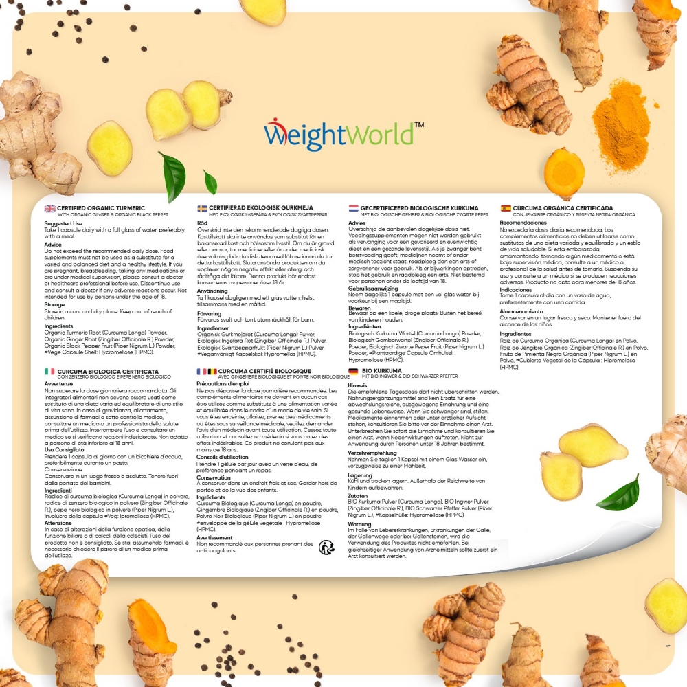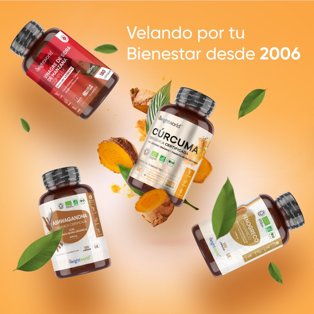 Las cápsulas de Cúrcuma natural y orgánica están avaladas por WeightWorld, tu marca de confianza presente en el mercado desde el año 2006. Más de 15 años de historia garantizan la máxima calidad de todos nuestros suplementos y productos, formulados con ingredientes de origen natural y sin OGM. Miles de clientes en más de una decena de países han depositado ya su confianza y bienestar en nosotros.