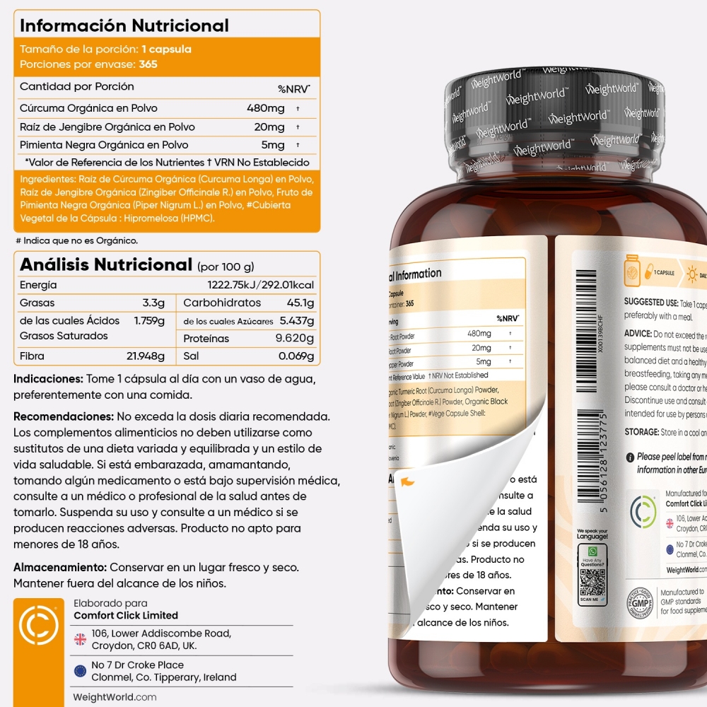 El suplemento de Cúrcuma en cápsulas con jengibre y pimienta negra disponible en WeightWorld es vegano, sin gluten, sin lactosa ni OGM. Ha sido elaborado en territorio de la Unión Europea.
