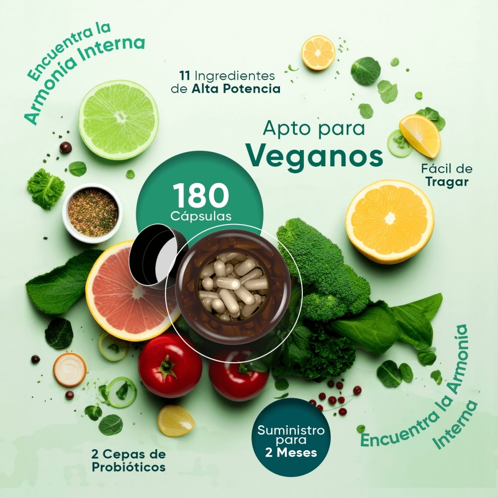 - Suplemento de origen natural con extractos de plantas y probióticos
