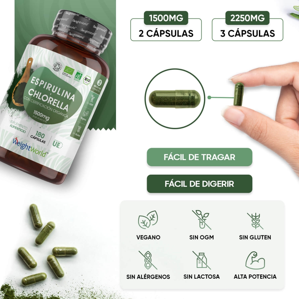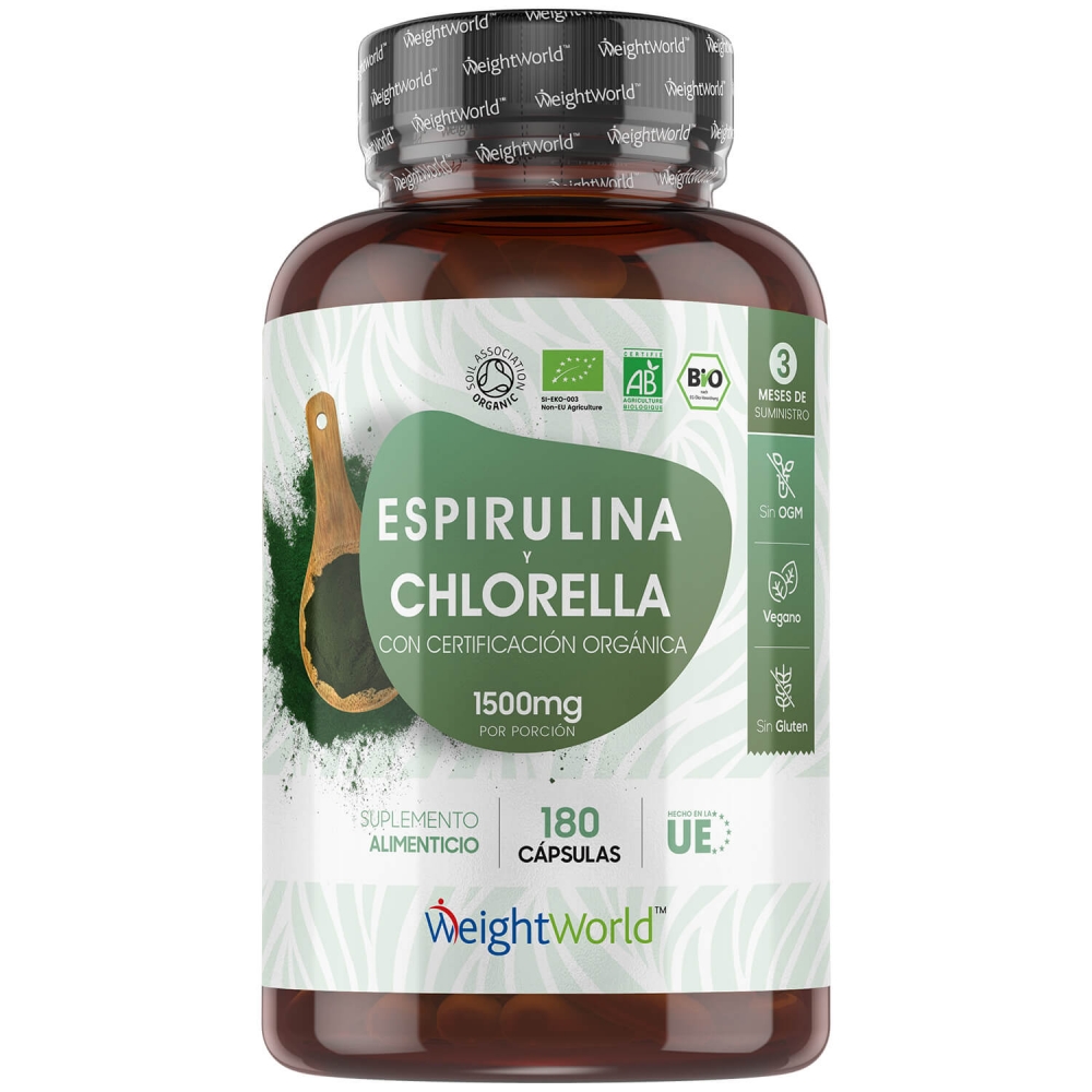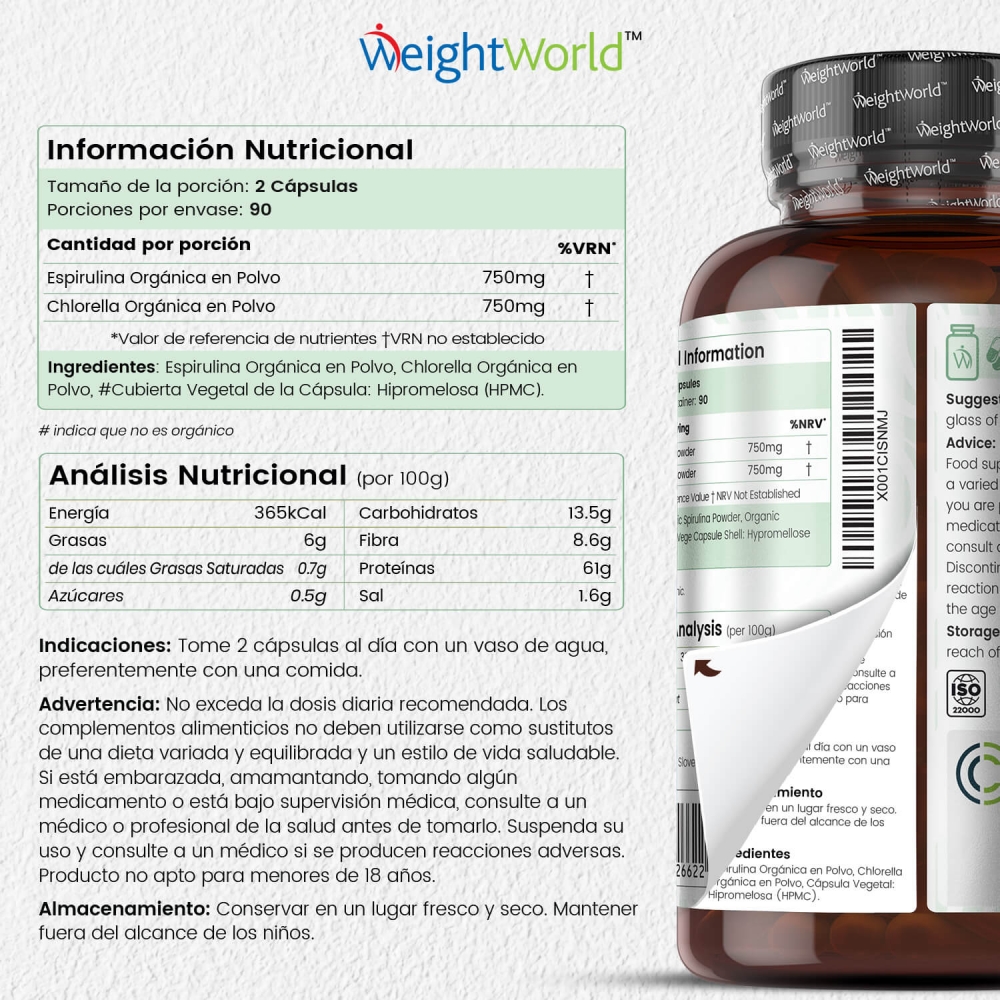 En WeightWorld, hemos combinado estas dos diminutas joyas verdes nacidas en el agua en una fórmula equilibrada: 870 mg de espirulina y 870 mg de chlorella, haciendo un total de 1740 mg por cada 3 cápsulas. Cada envase contiene 240 cápsulas. Tomando 3 al día, tendrás suministro para 3 meses. Este suplemento cuenta con certificación orgánica, no tiene gluten ni OGM y es apto para veganos.