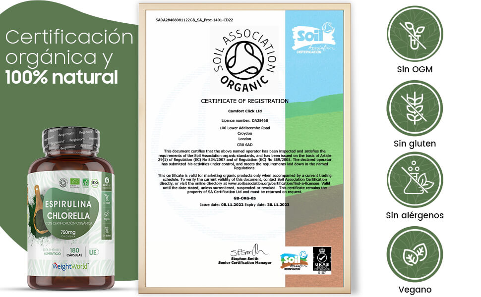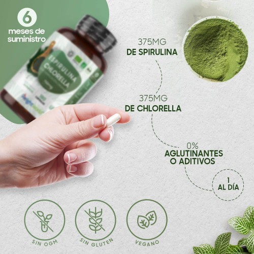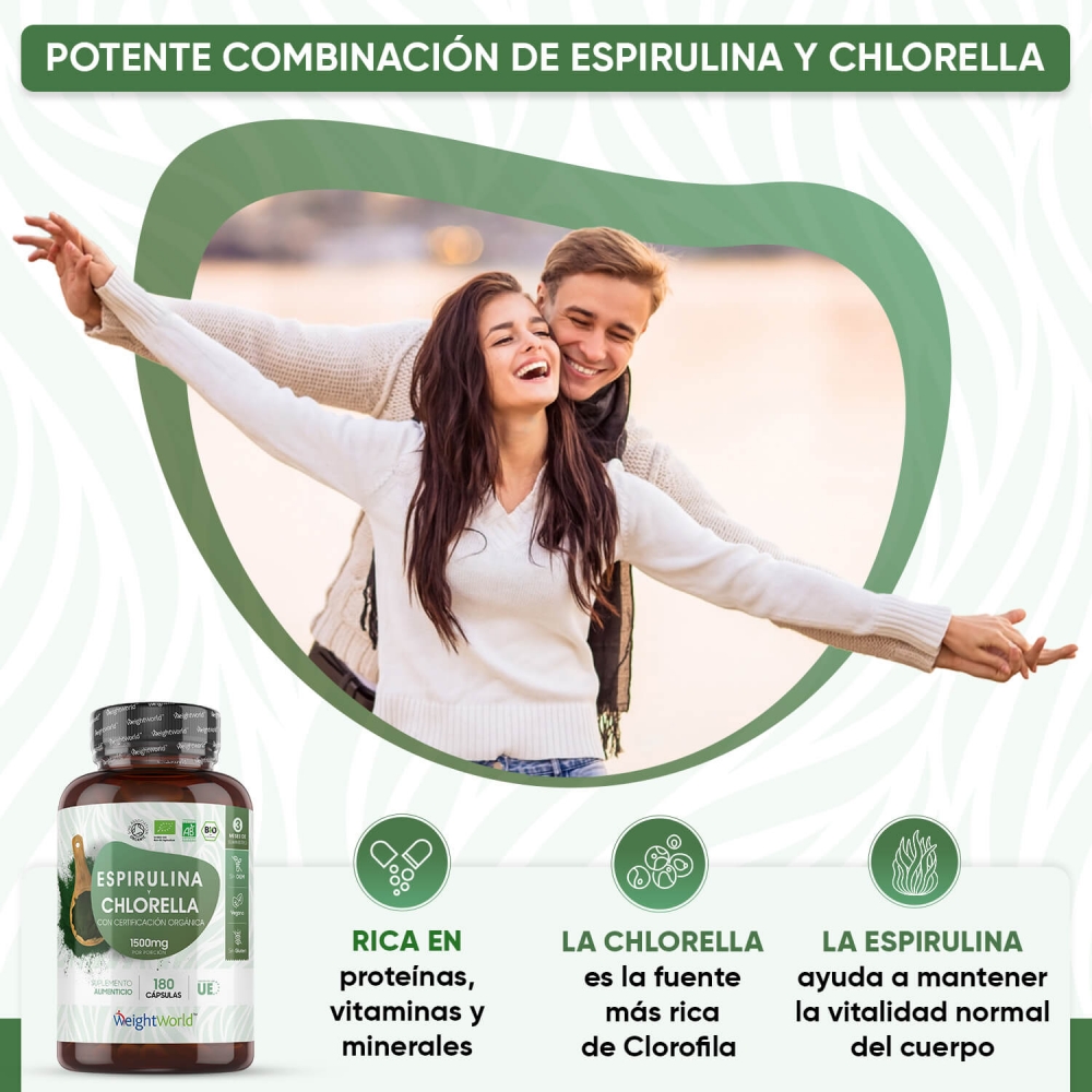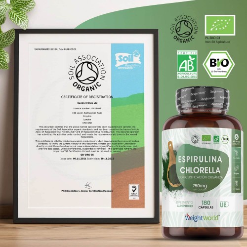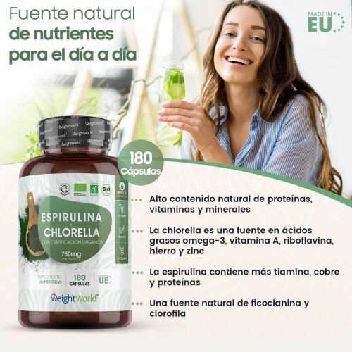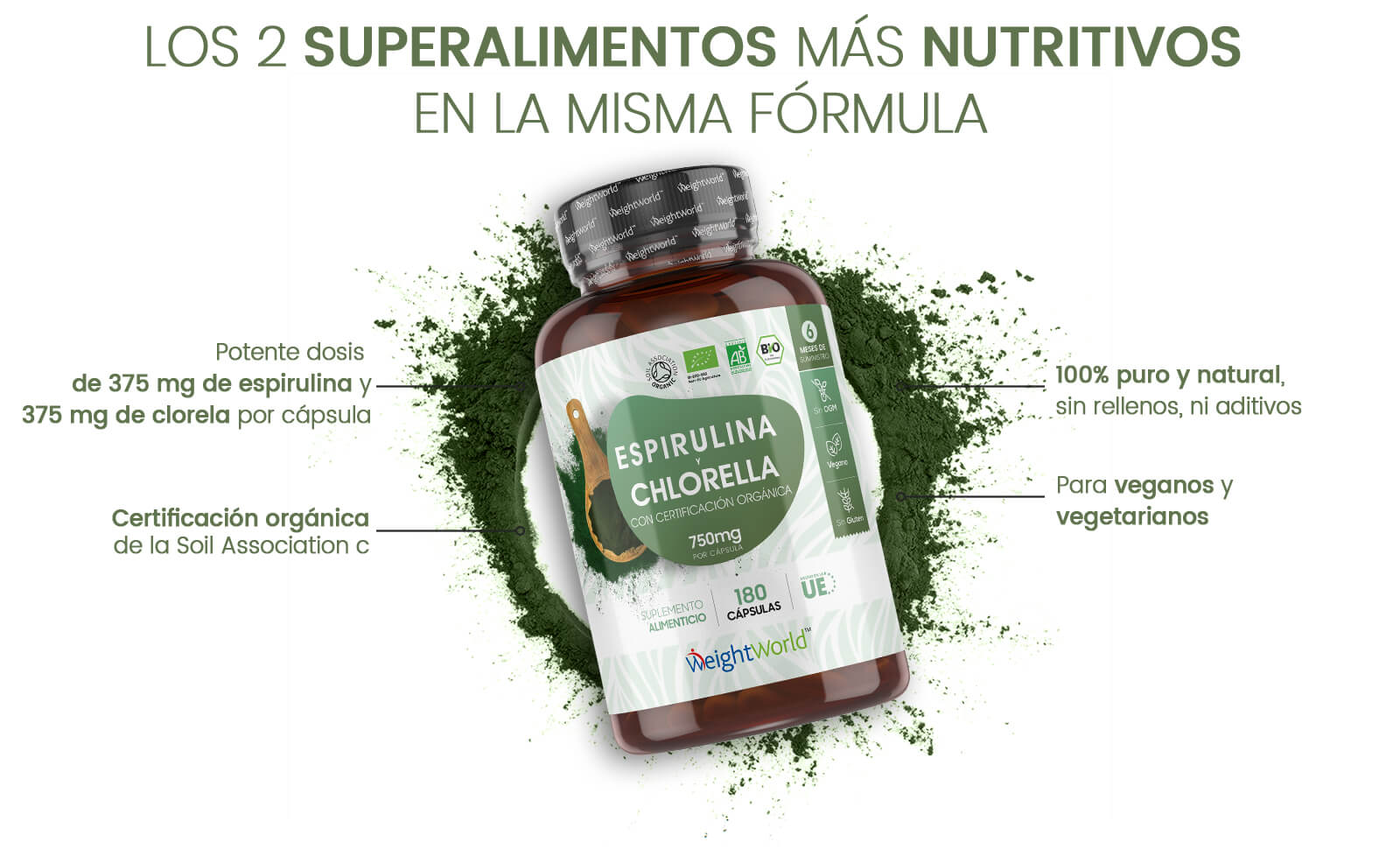 En WeightWorld, hemos combinado estas dos diminutas joyas verdes nacidas en el agua en una fórmula equilibrada: 870 mg de espirulina y 870 mg de chlorella, haciendo un total de 1740 mg por cada 3 cápsulas. Cada envase contiene 240 cápsulas. Tomando 3 al día, tendrás suministro para 3 meses. Este suplemento cuenta con certificación orgánica, no tiene gluten ni OGM y es apto para veganos.