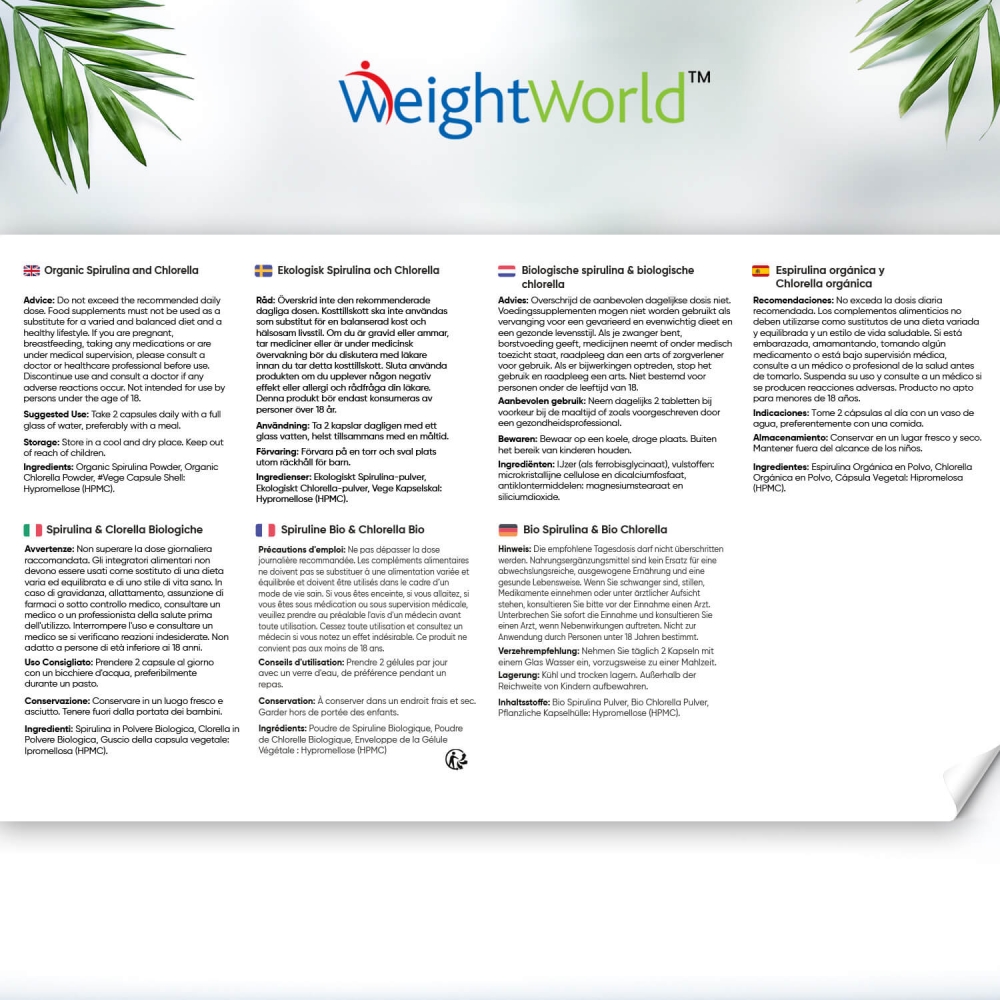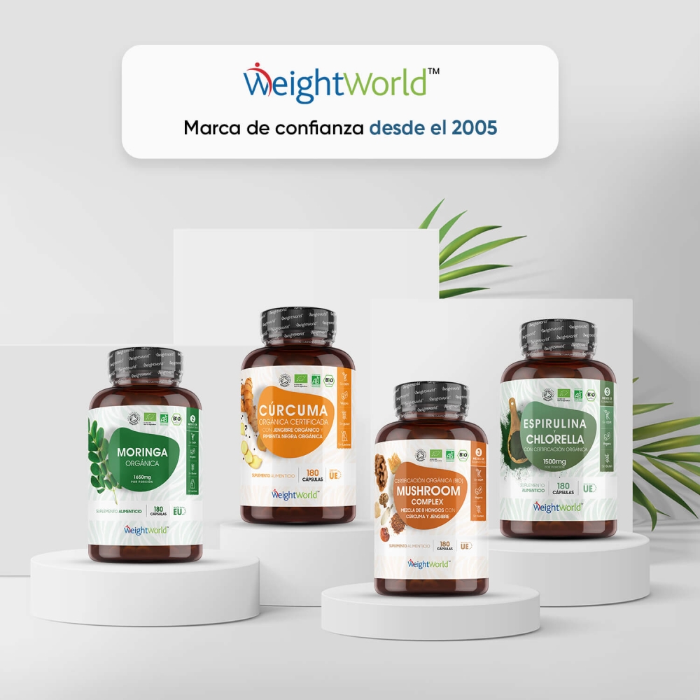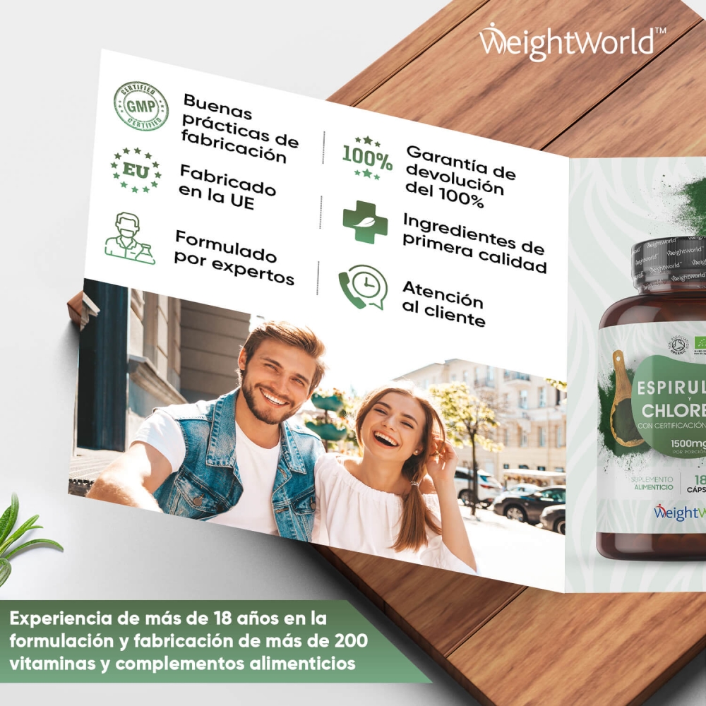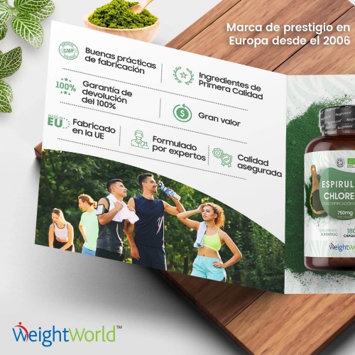 Las cápsulas de Chlorella y Espirulina vienen avaladas por WeightWorld, tu marca de confianza presente en el mercado desde el año 2006. Más de 15 años de historia garantizan la máxima calidad de todos nuestros suplementos y productos, formulados con ingredientes de origen natural y sin OGM. Miles de clientes en más de una decena de países han depositado ya su confianza y bienestar en nosotros.