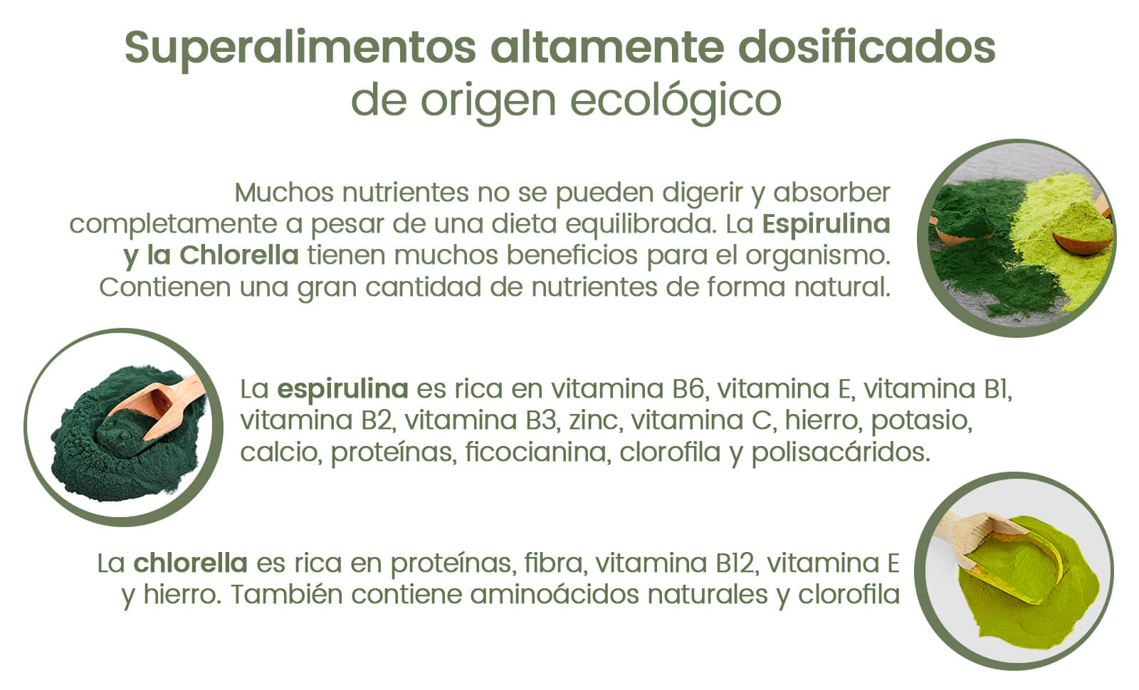 - La chlorella es fuente natural de nutrientes, vitaminas y minerales que participan en el metabolismo energético del cuerpo#.