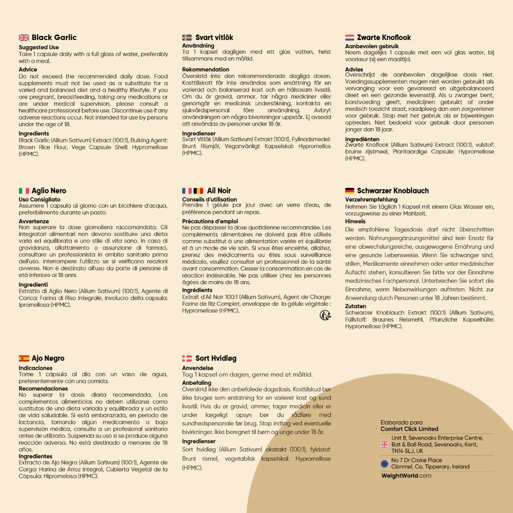Extracto de Ajo Negro (Allium Sativum) (20:1), Cubierta Vegetal de la Cápsula: Hipromelosa (HPMC).