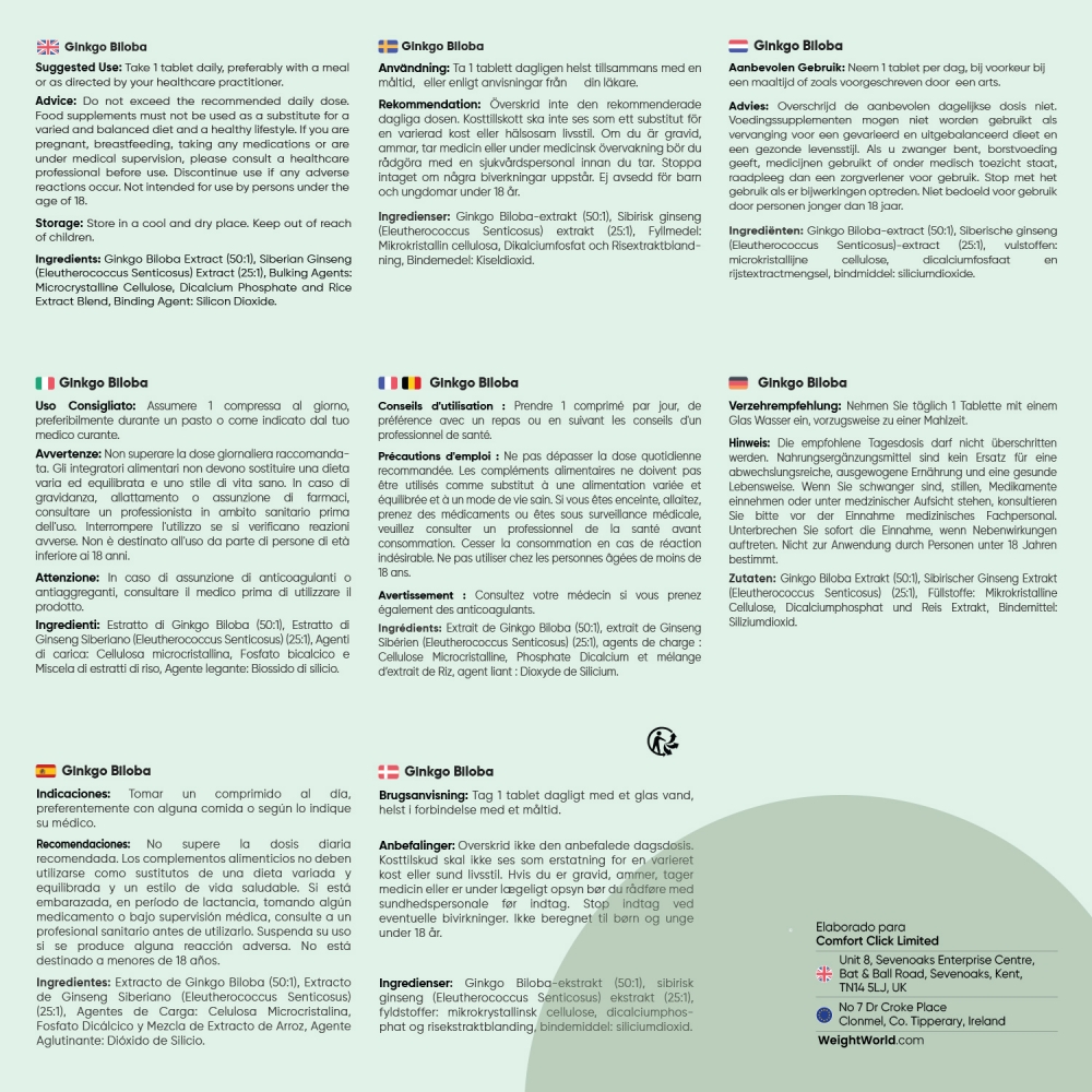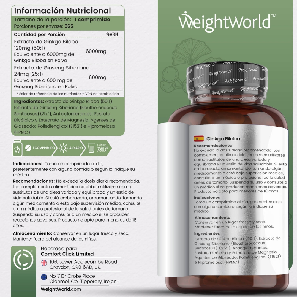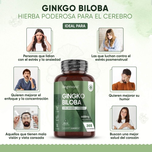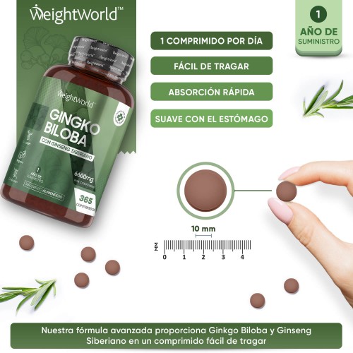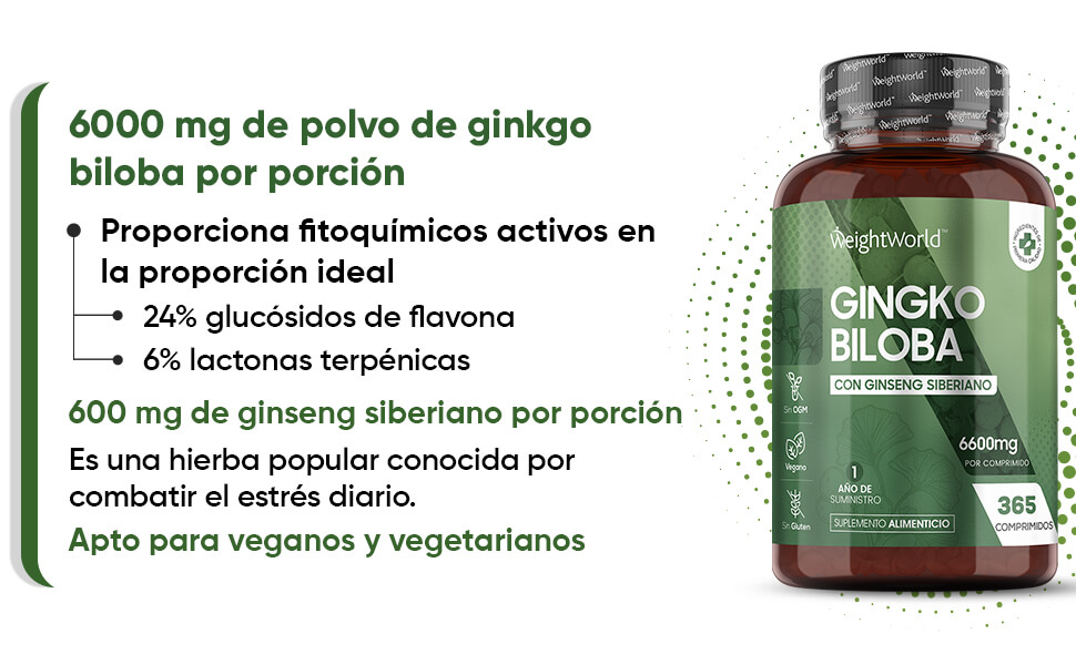 Si deseas potenciar tu día a día con un suplemento de origen natural, los comprimidos de Ginkgo Biloba de WeightWorld proponen una potente dosis de 6000 mg por tableta. Además, nuestra fórmula contiene ginseng siberiano (600 mg por comprimido), de la más alta calidad. Cada envase contiene 365 comprimidos suficientes para 1 año de suministro. Este suplemento con ginseng y ginkgo biloba es apto para veganos, sin gluten y sin estearato de magnesio.