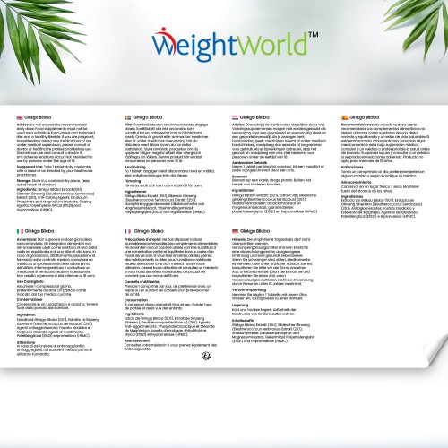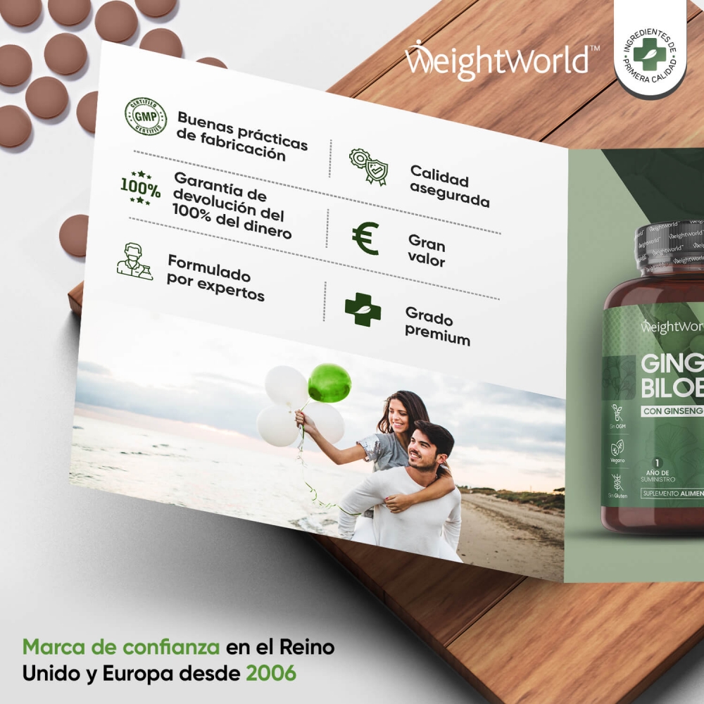 Las pastillas de Ginkgo Biloba vienen avaladas por WeightWorld, tu marca de confianza presente en el mercado desde el año 2006. Más de 15 años de historia garantizan la máxima calidad de todos nuestros suplementos y productos, formulados con ingredientes de origen natural y sin OGM. Descubre por qué cada vez más personas eligen nuestro Ginkgo Biloba: