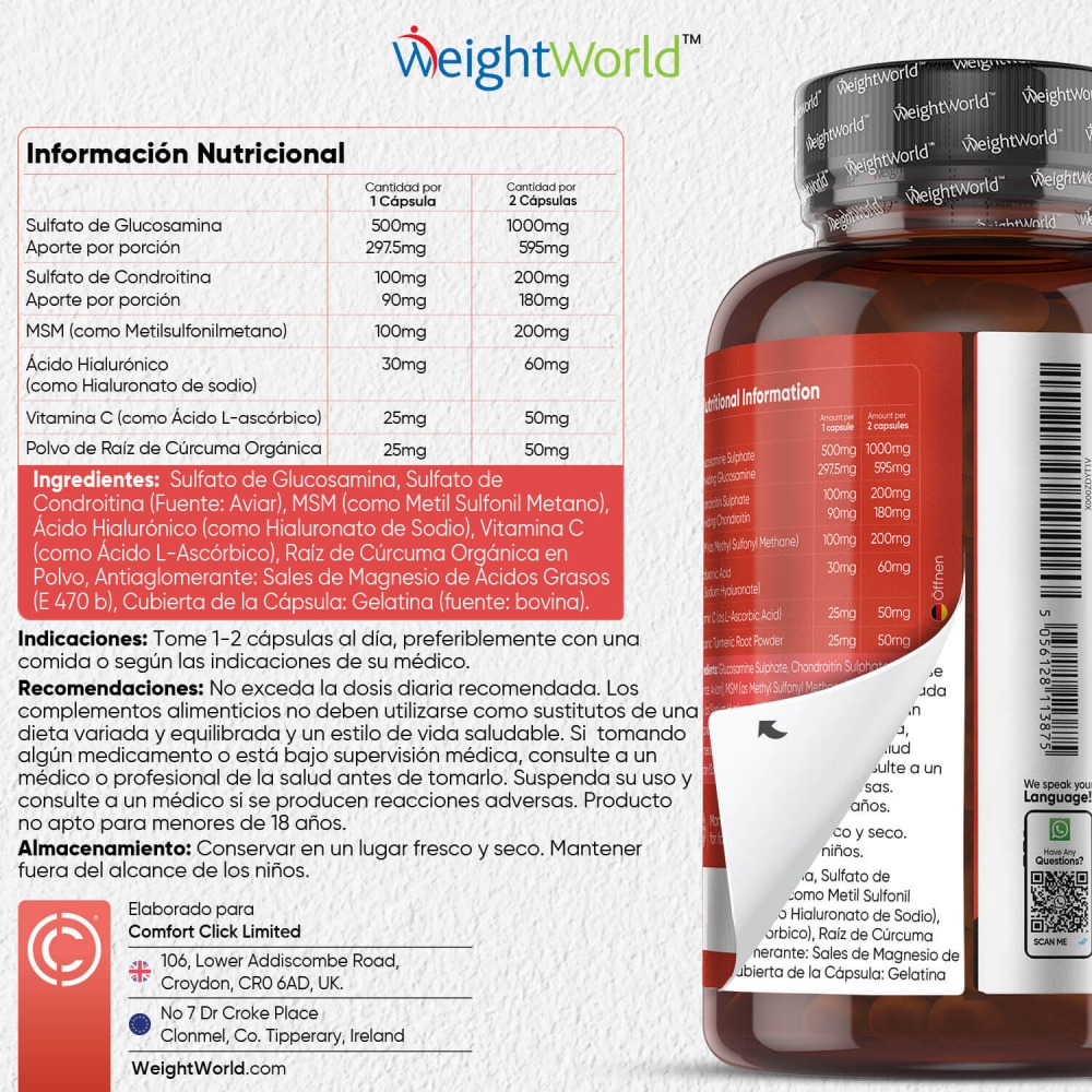 Sulfato de Glucosamina, Sulfato de Condroitina (Fuente: Aviar), MSM (como Metil Sulfonil Metano), Ácido Hialurónico (como Hialuronato de Sodio), Vitamina C (como Ácido L-Ascórbico), Raíz de Cúrcuma Orgánica en Polvo, Antiaglomerante: Sales de Magnesio de Ácidos Grasos (E 470 b), Cubierta de la Cápsula: Gelatina.