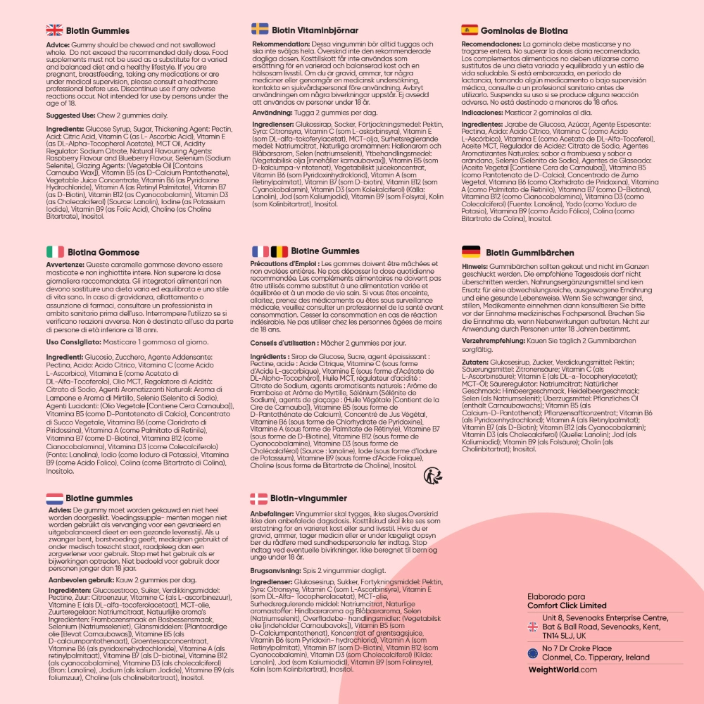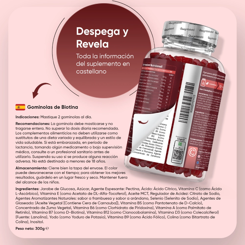 - Potente dosis de 450 mcg de biotina (B7) por gominola