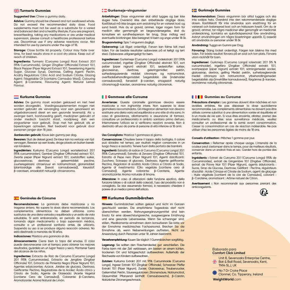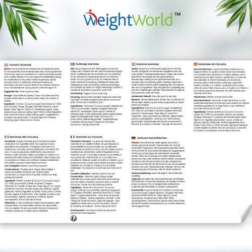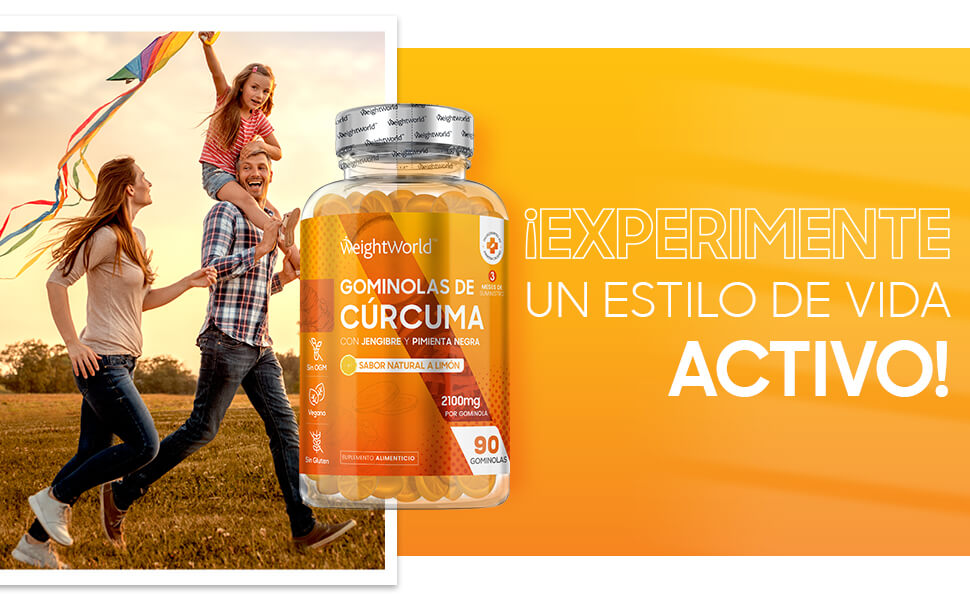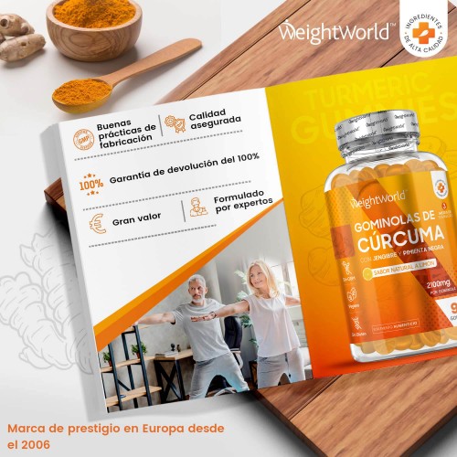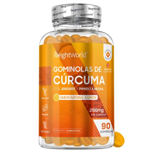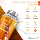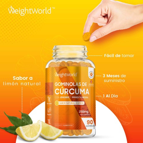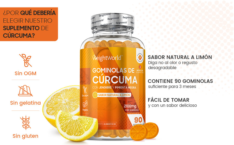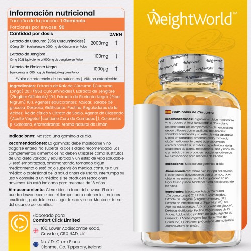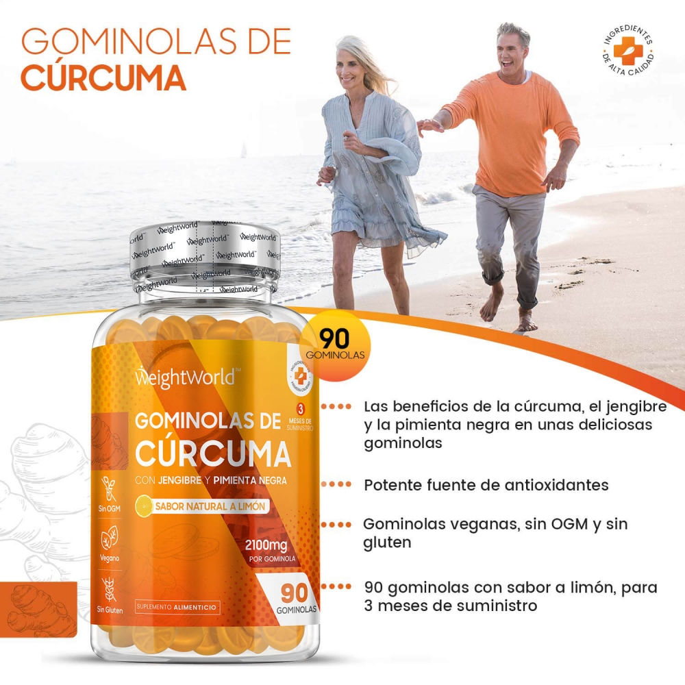 Extracto de Raíz de Cúrcuma (Curcuma Longa) (95% de curcuminoides), Extracto de Jengibre (Zingiber Officinale), Extracto de Pimienta Negra (Piper Nigrum), Azúcar, Jarabe de Glucosa, Dextrosa, Gelificante (pectina), Regulador de la Acidez (ácido cítrico y citrato de sodio), Agente de recubrimiento (Aceite Vegetal [contiene cera de carnauba]), aroma natural de limón, β-caroteno (color).